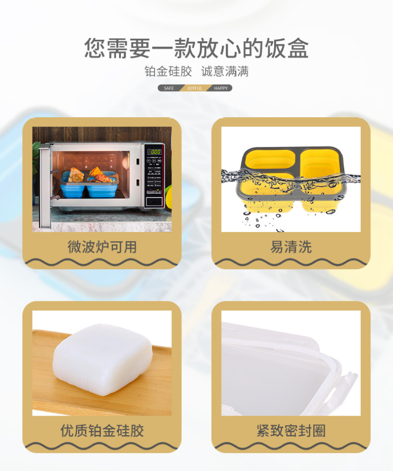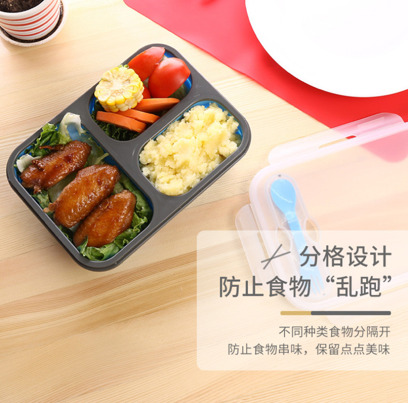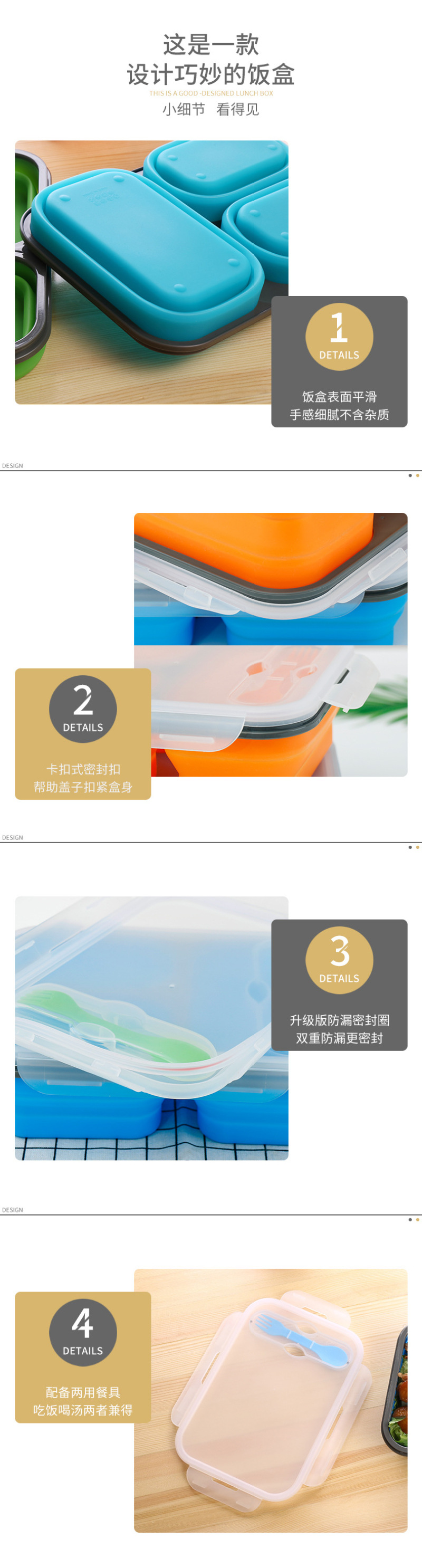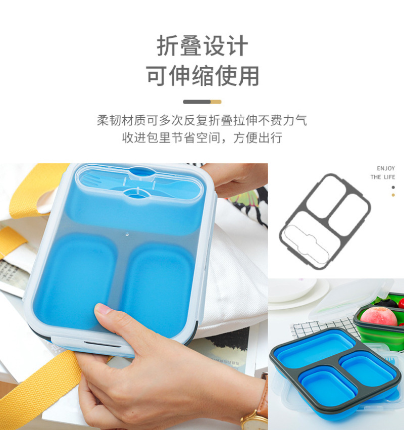 折叠 餐盒 三格硅胶饭盒 配勺叉微波炉便当盒密封保鲜盒午餐盒