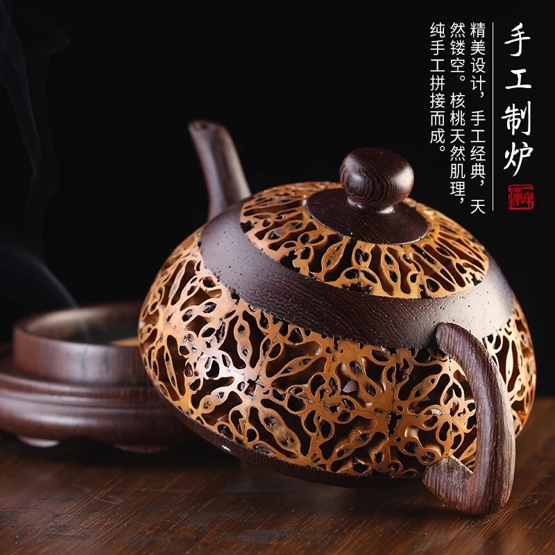 芸亭工艺核桃镂空檀香沉香茶香炉禅意摆件实木底座香薰摆件礼盒