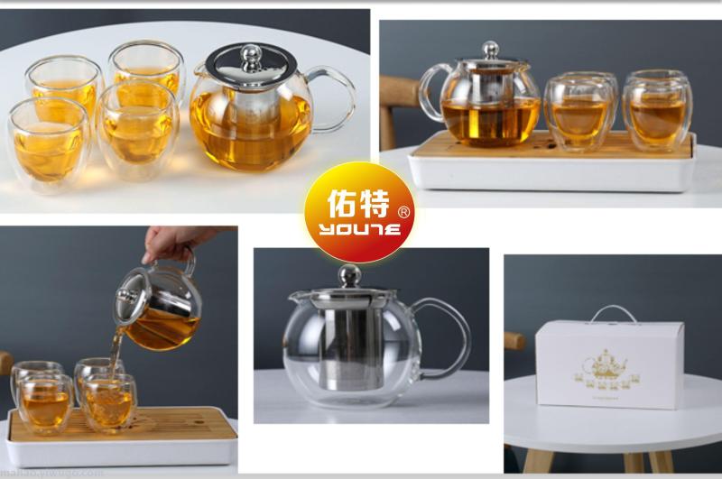玻璃茶壶套装1壶+4双层杯 配木底盘