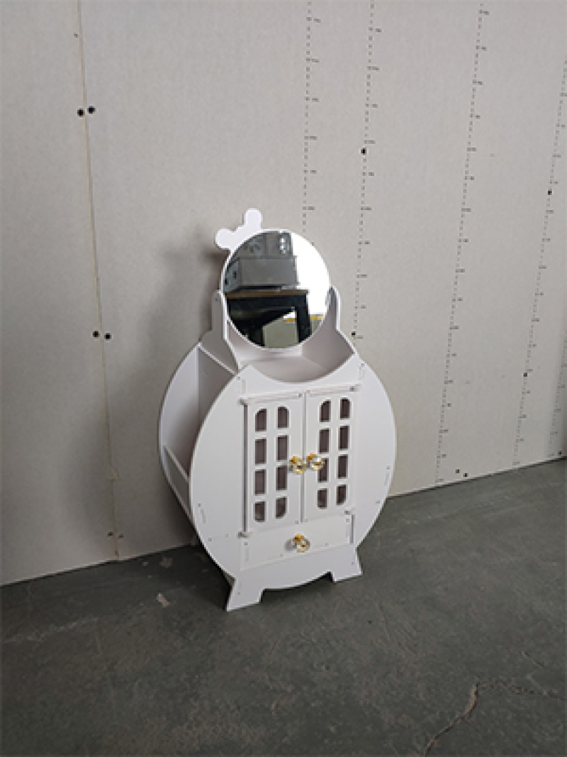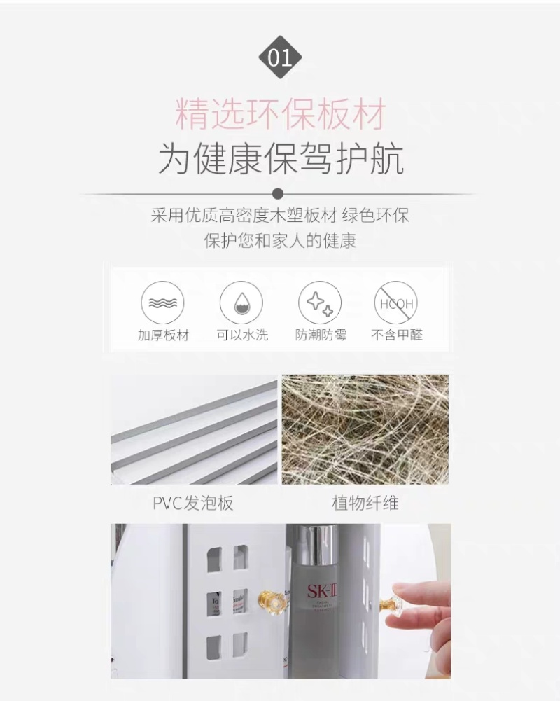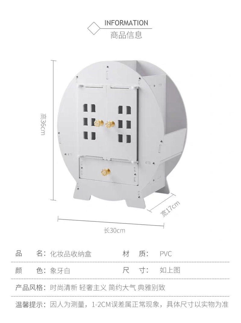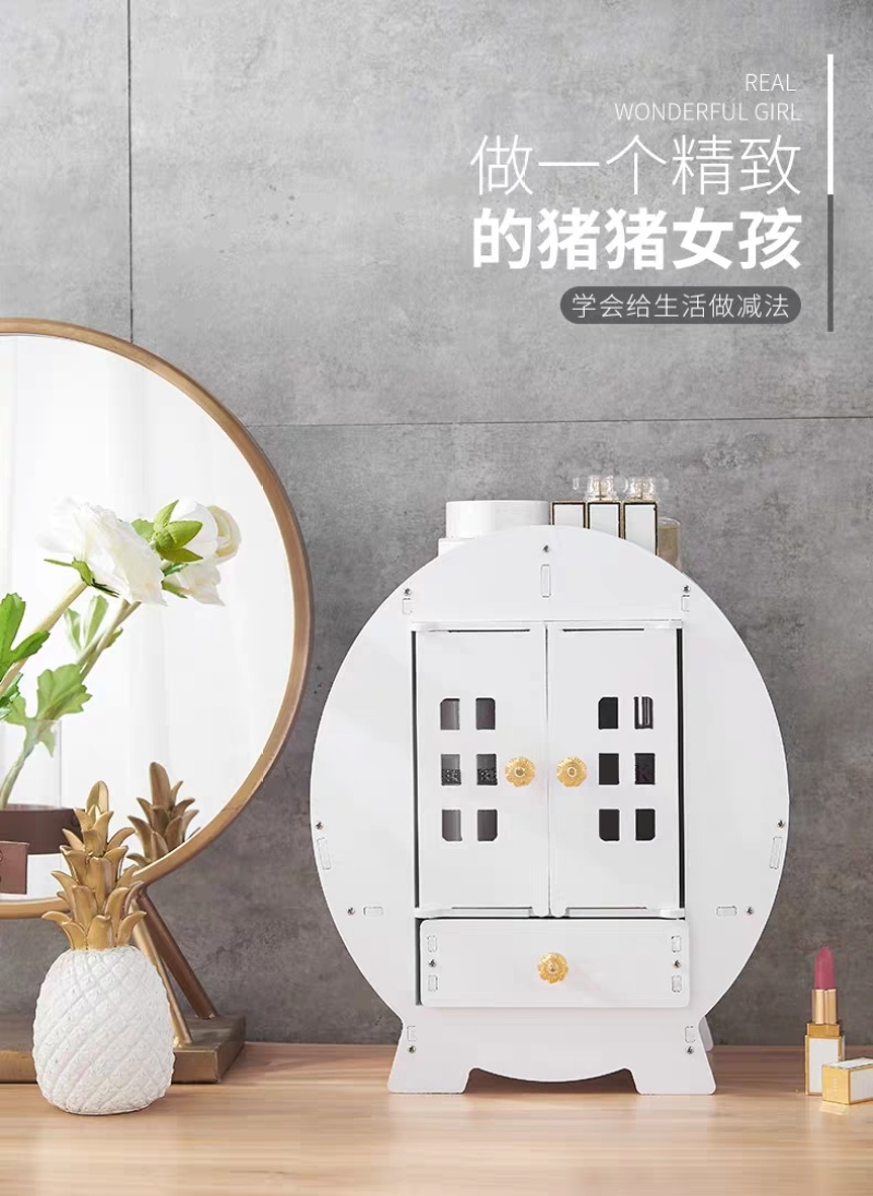 【产品名称】:圆形带镜化妆柜 【产品型号】:ZW2868 【产品尺寸】:36*30*17(不加镜子的尺寸) 【产品材质】:木塑板