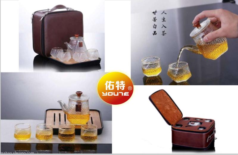 精致便携玻璃手工锤纹茶壶套装配木底盘