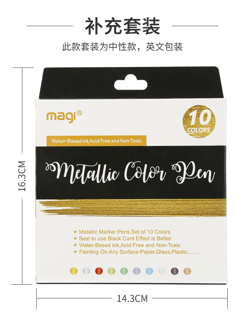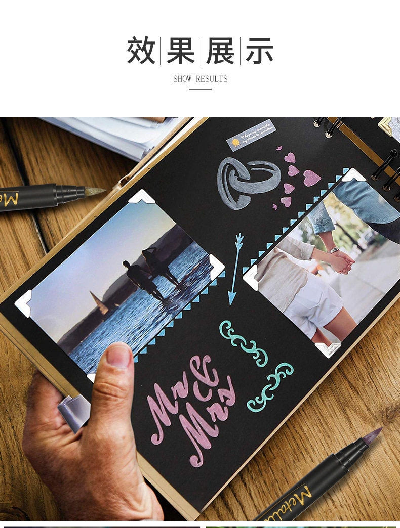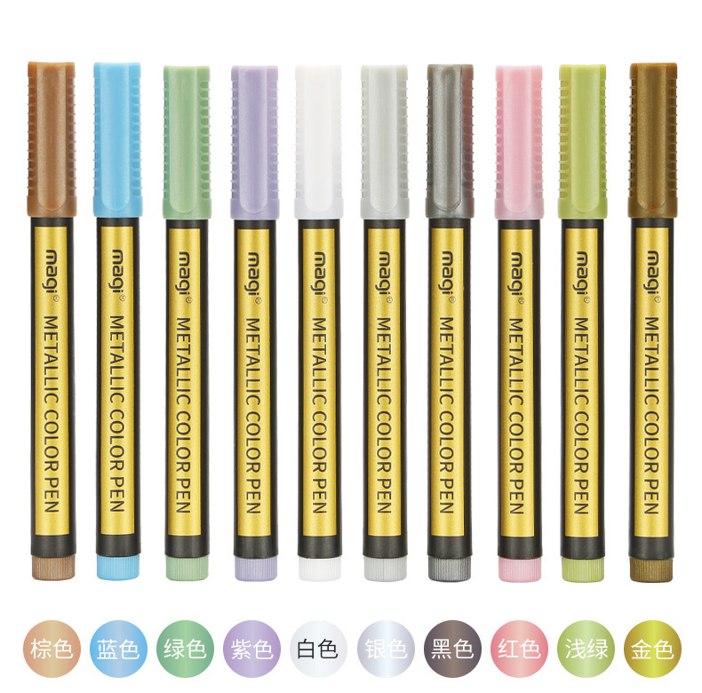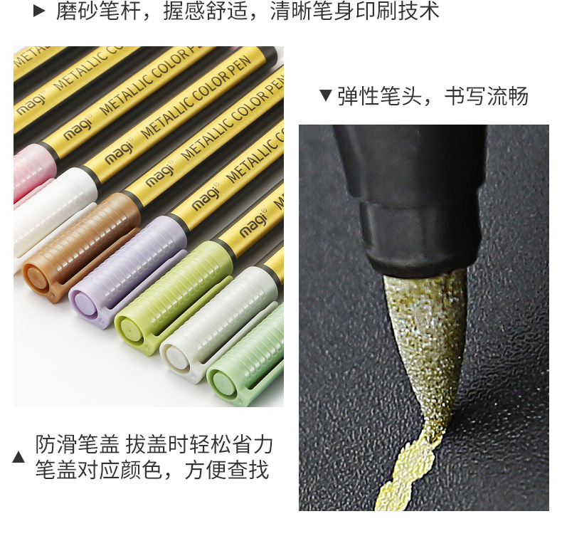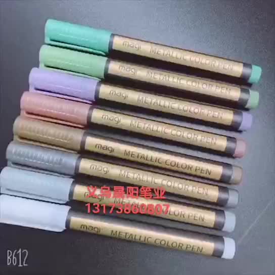 产品用途:软头金属色马克笔带有珠光效果适用于石头木材金属玻璃帆布贺卡黑卡纸陶瓷DIY相册涂鸦记号笔绘画金属毛刷笔采用德国水性颜料墨水环保无毒快干防水遮盖力耐晒能力强质感金属光泽效果采用日本进口软笔头笔锋柔美书写流畅色彩绚丽PP环保材料不易摔坏