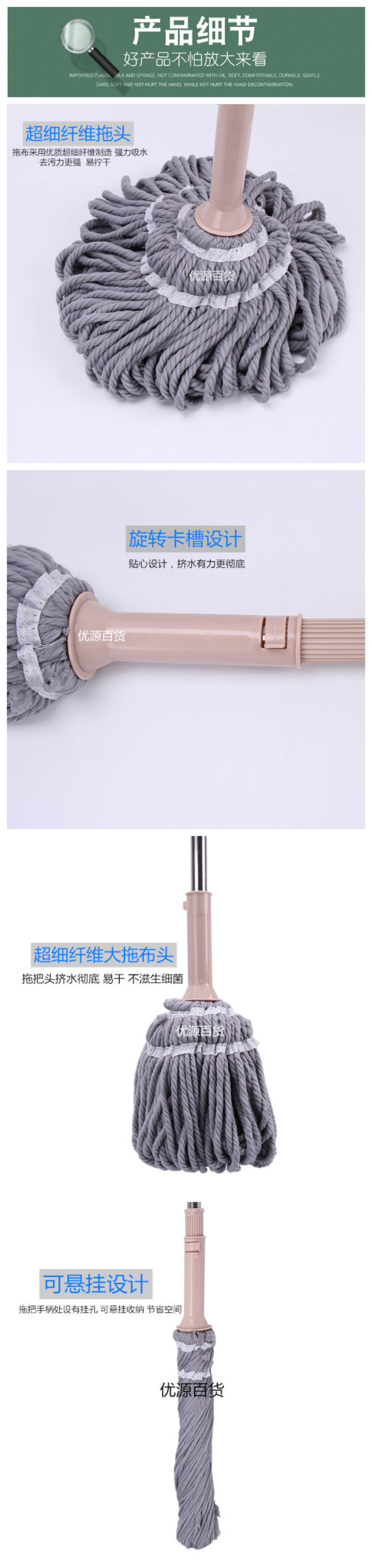 此款拖把采用旋转卡槽设计,挤水更有力和彻底;拖把全长约119CM,不用弯腰拖地,从而更省力;另外采用超细纤维大拖布头,挤水更易干;杆子用优质不锈刚杆,不晃动,不变形,更结实和耐用。