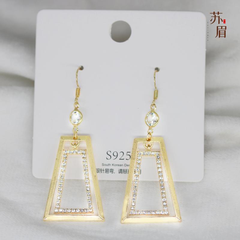 新款s925银耳钩时尚气质百搭耳坠几何梯形耳环微镶超闪水钻耳饰女