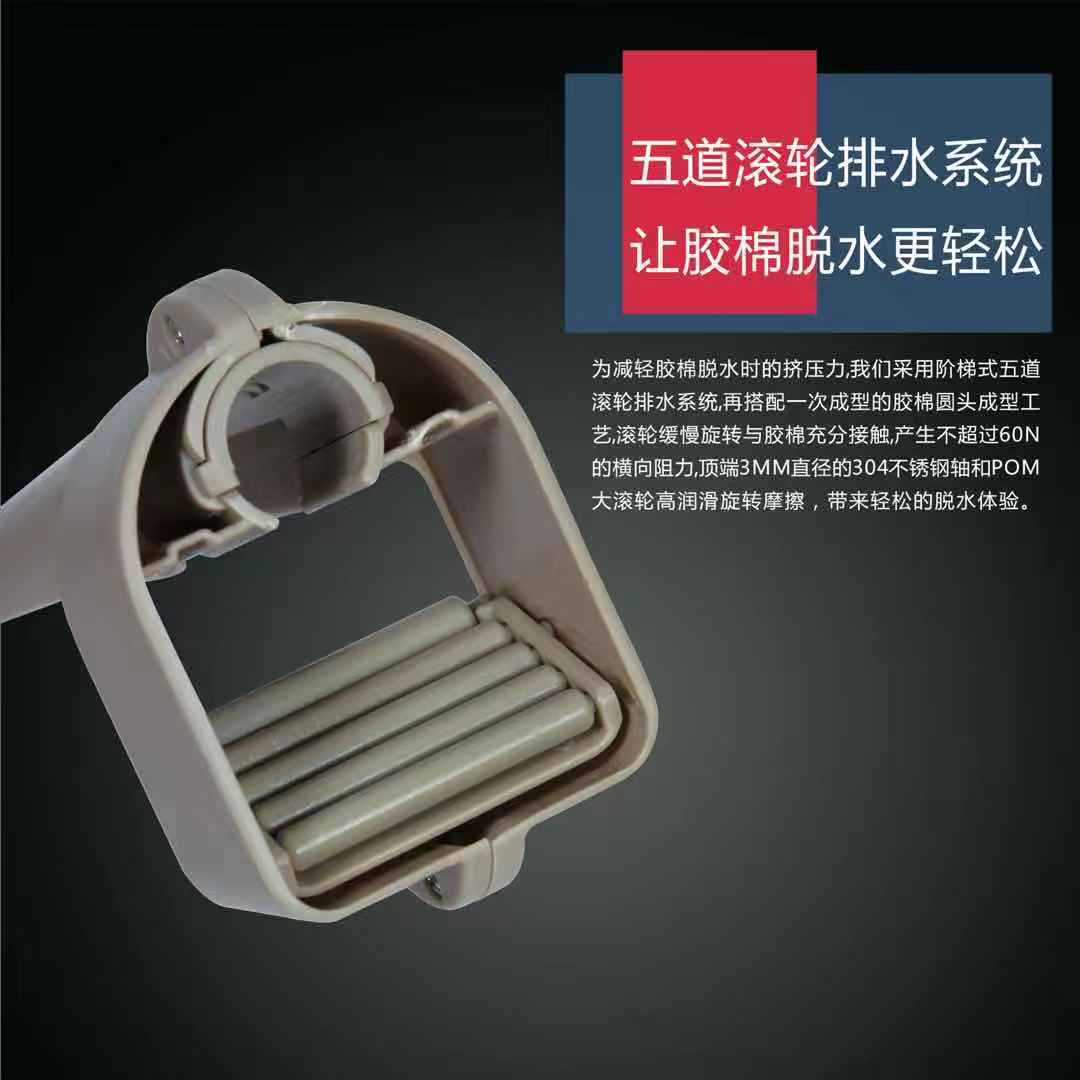 新款胶棉拖把结合新一代改进后强吸水,五道滚轮排水脱水更轻松,免手洗、全方位无死角拖地更方便,180度自动回弹功能,脏污易冲洗,站立易收纳,提高您的生活品质。