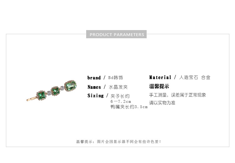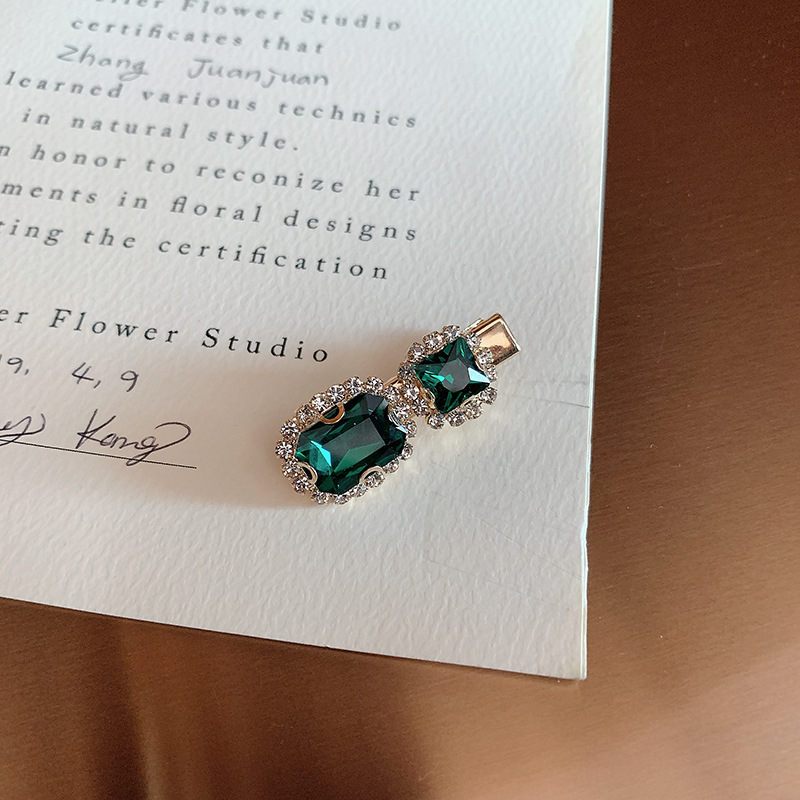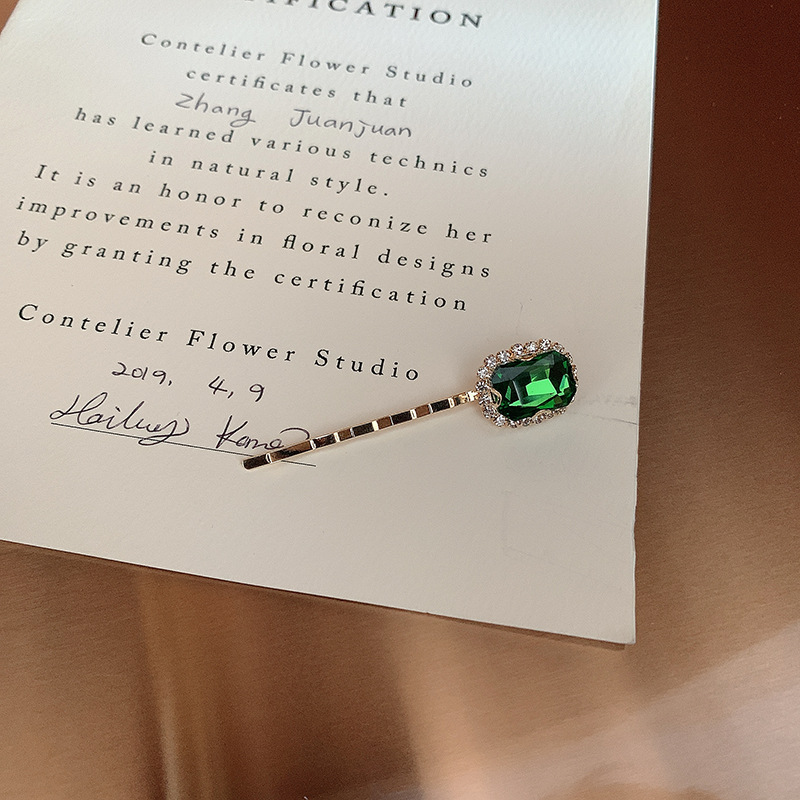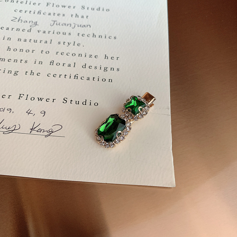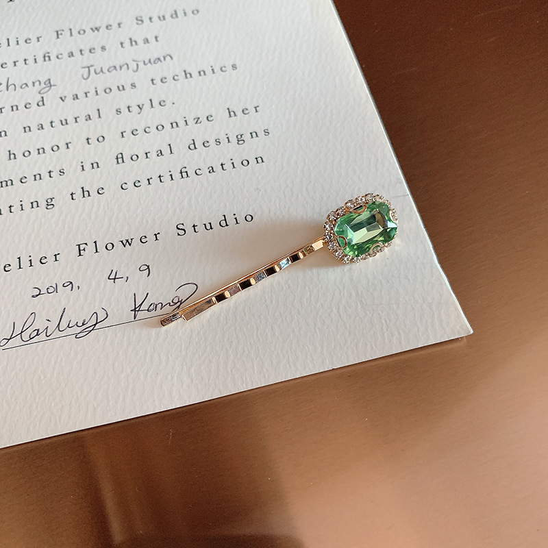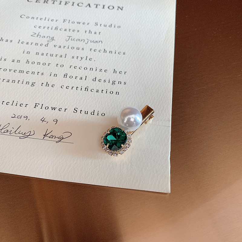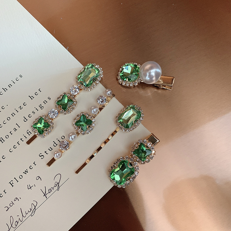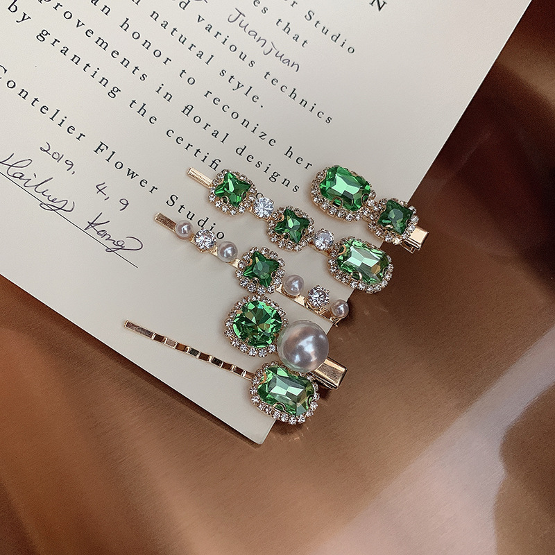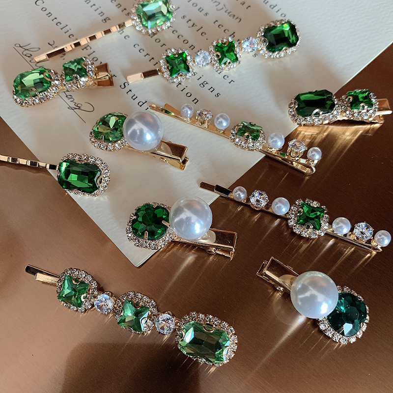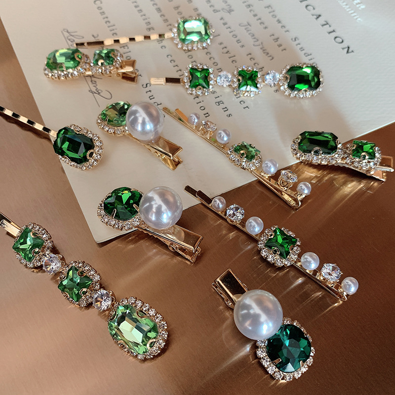 复古绿发夹韩国轻奢水钻珍珠刘海夹女 一字夹网红ins发饰边夹发卡