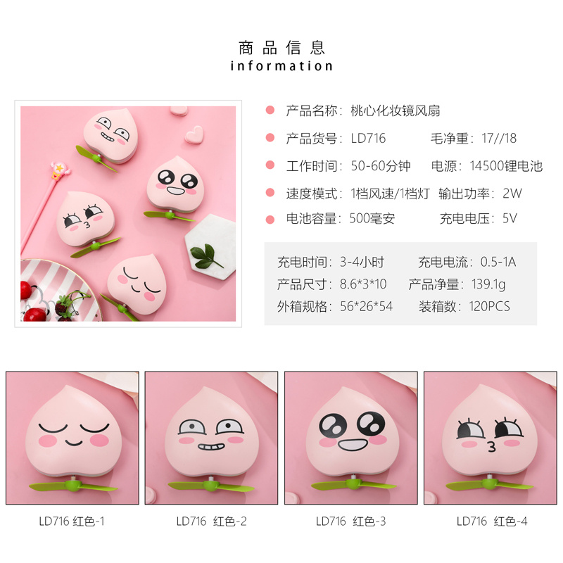 抖音网红粉粉色桃心化妆镜风扇迷你可爱USB充电小电动扇口袋便携