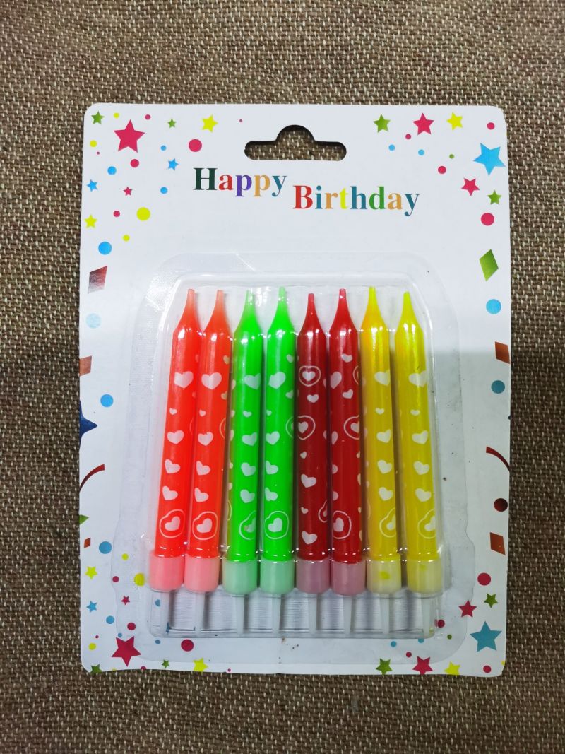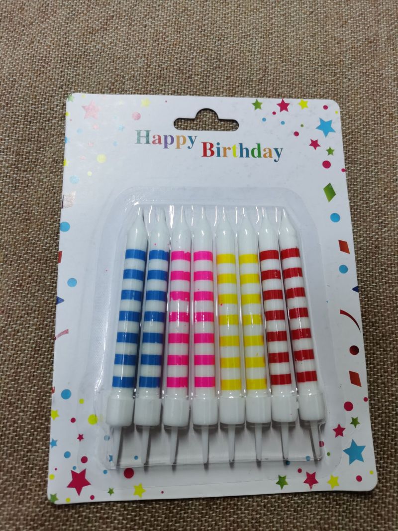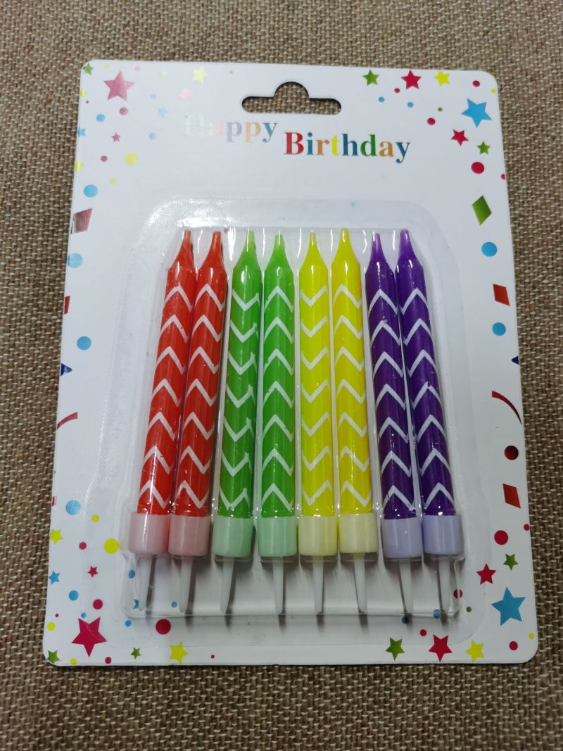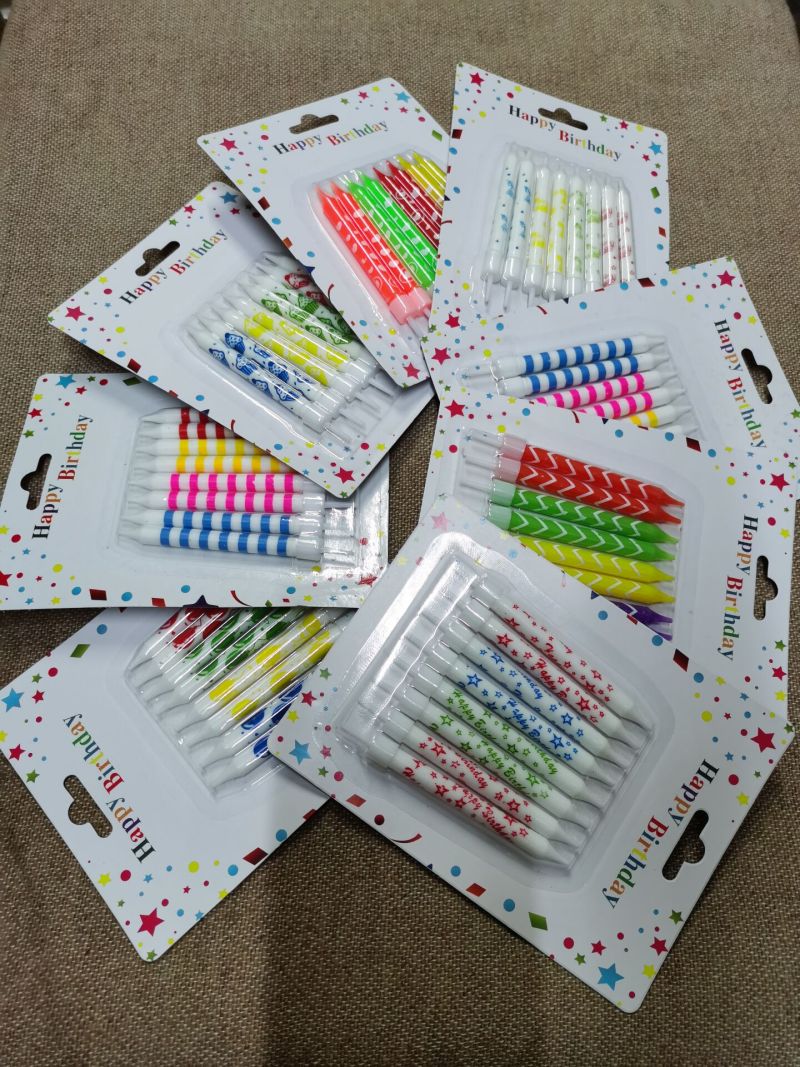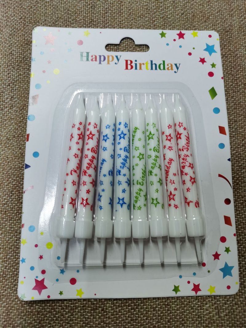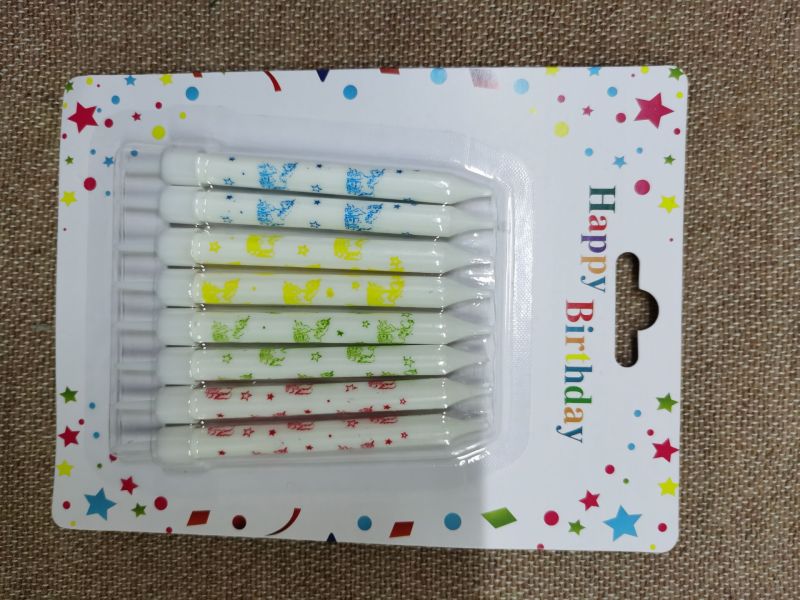 品名丝印卡通图案生日蜡烛 材质;石蜡 定制:可以 蜡烛尺寸:0.75x8cm 图案:彩色条纹 英文字母 玻璃纹 气球 冰淇淋 包装:8支吸塑 装箱数:288pcs