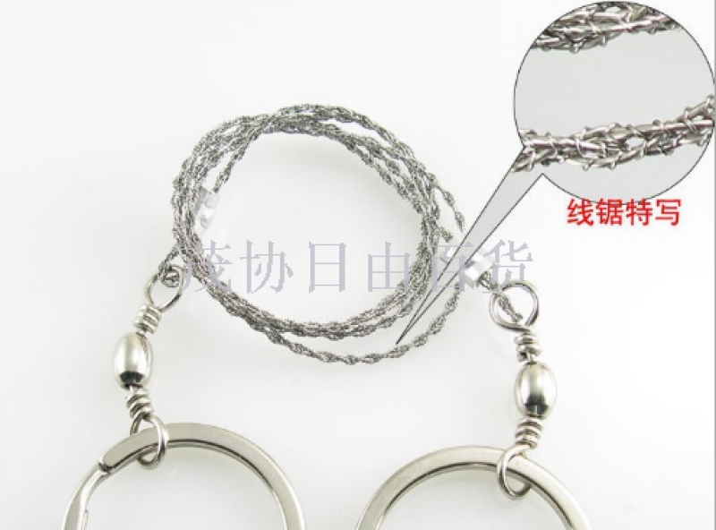 线锯是求生背包中的一件重要物品,线锯的锯齿很细密,使用时须小心线锯生锈会使其锯齿变钝,每次用完后应擦干净,涂润食物油。它可以从任意方向切断木头、塑料。