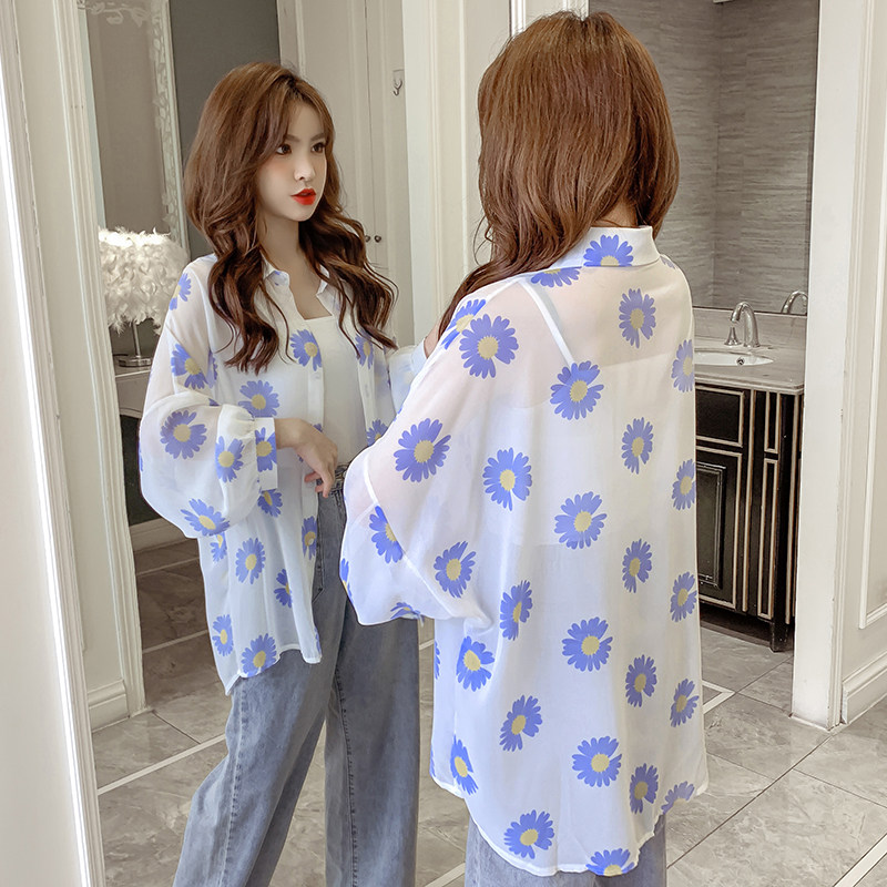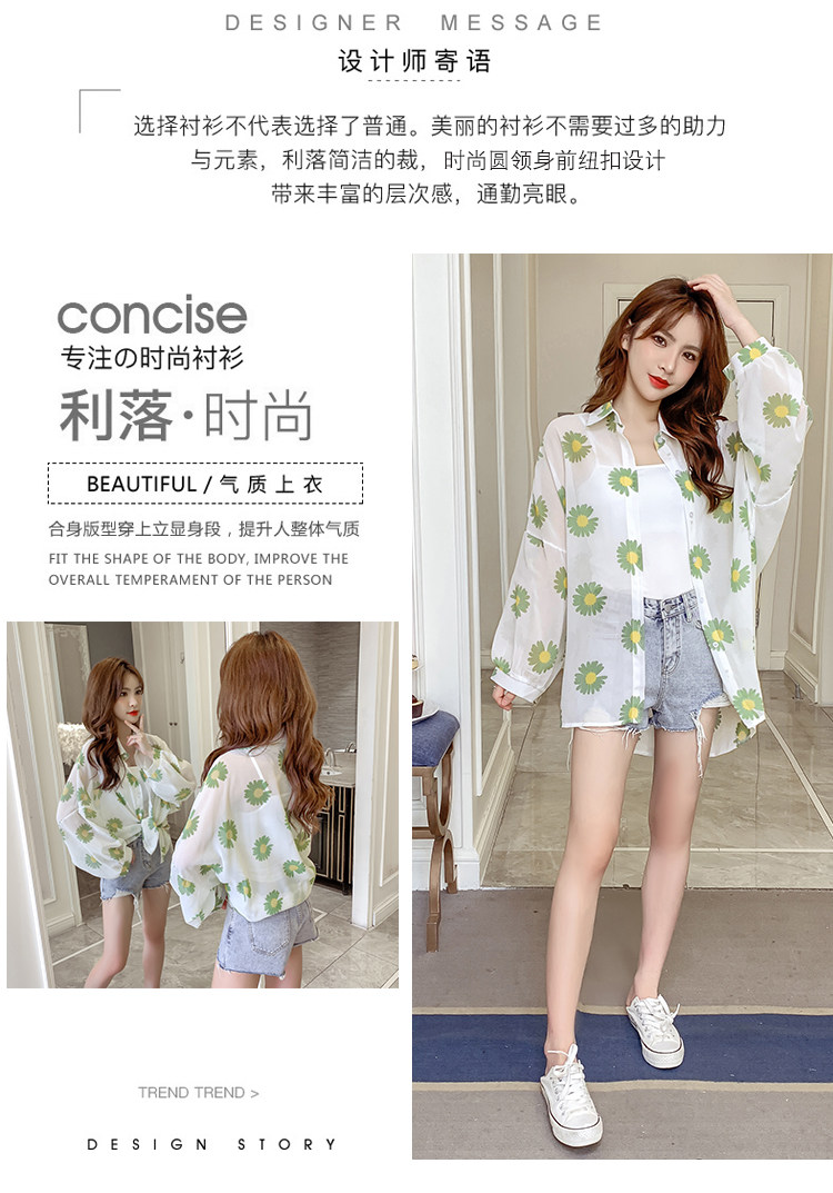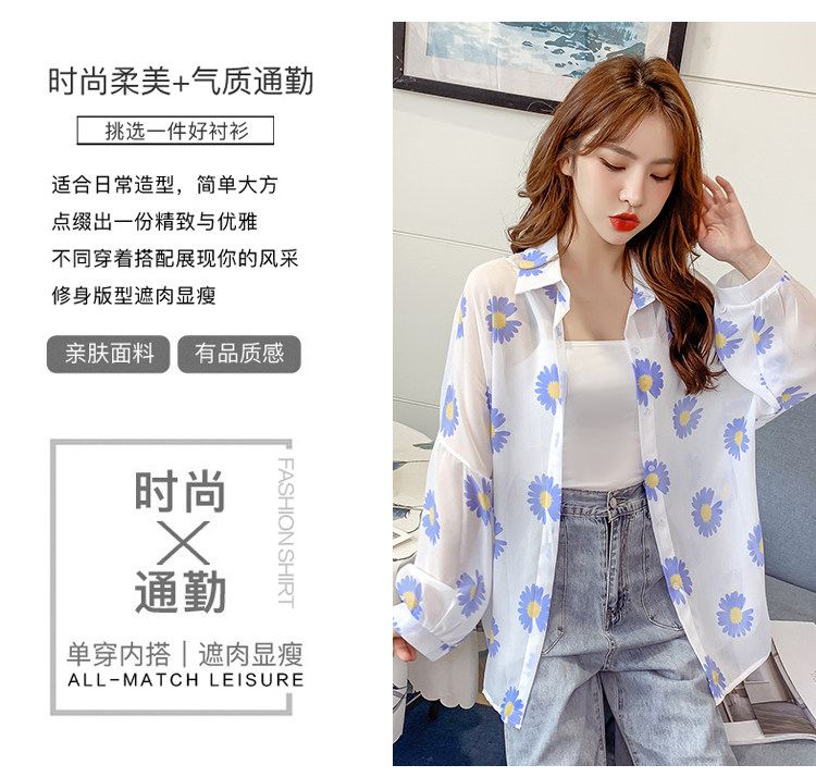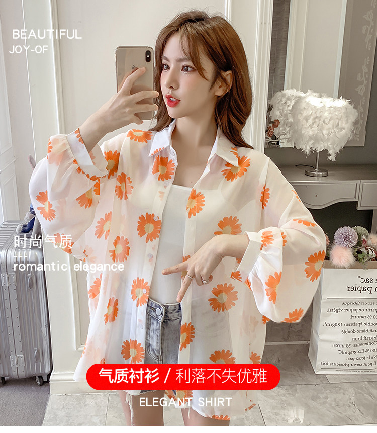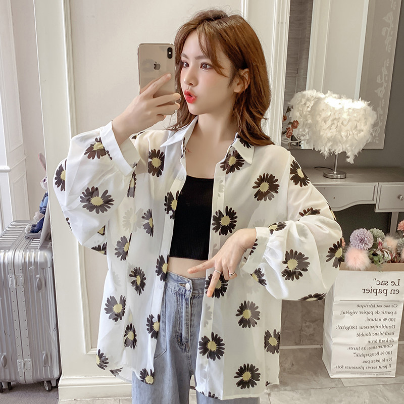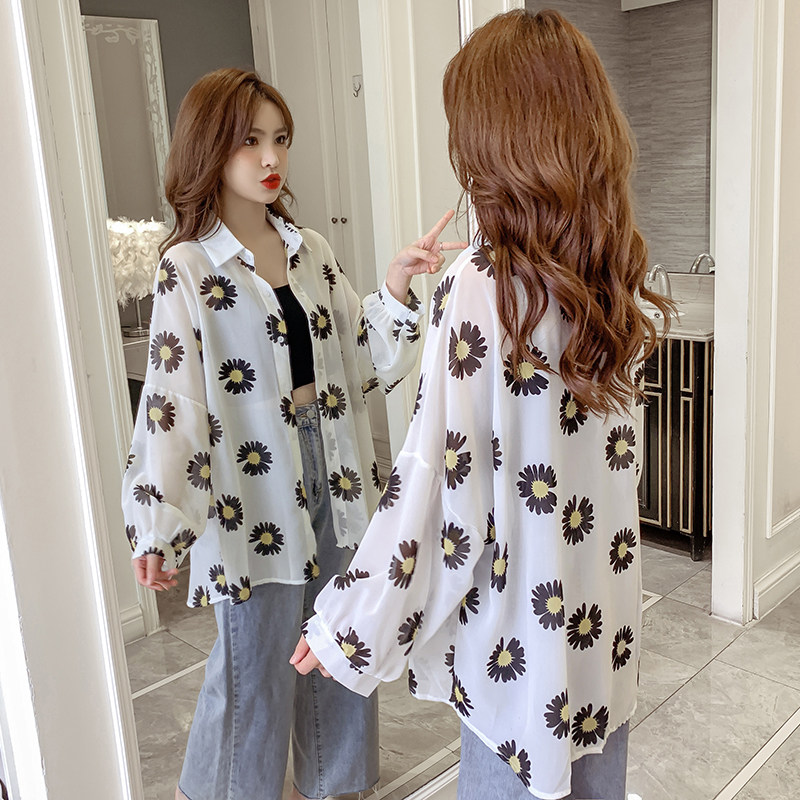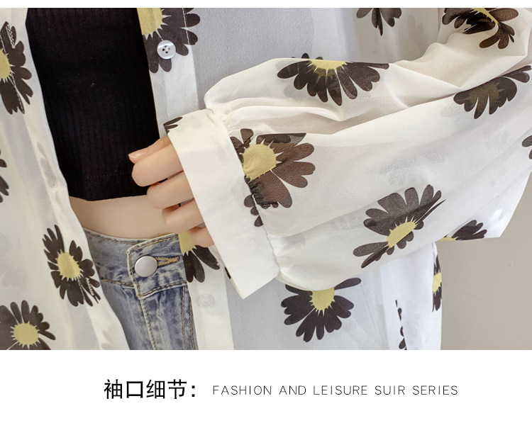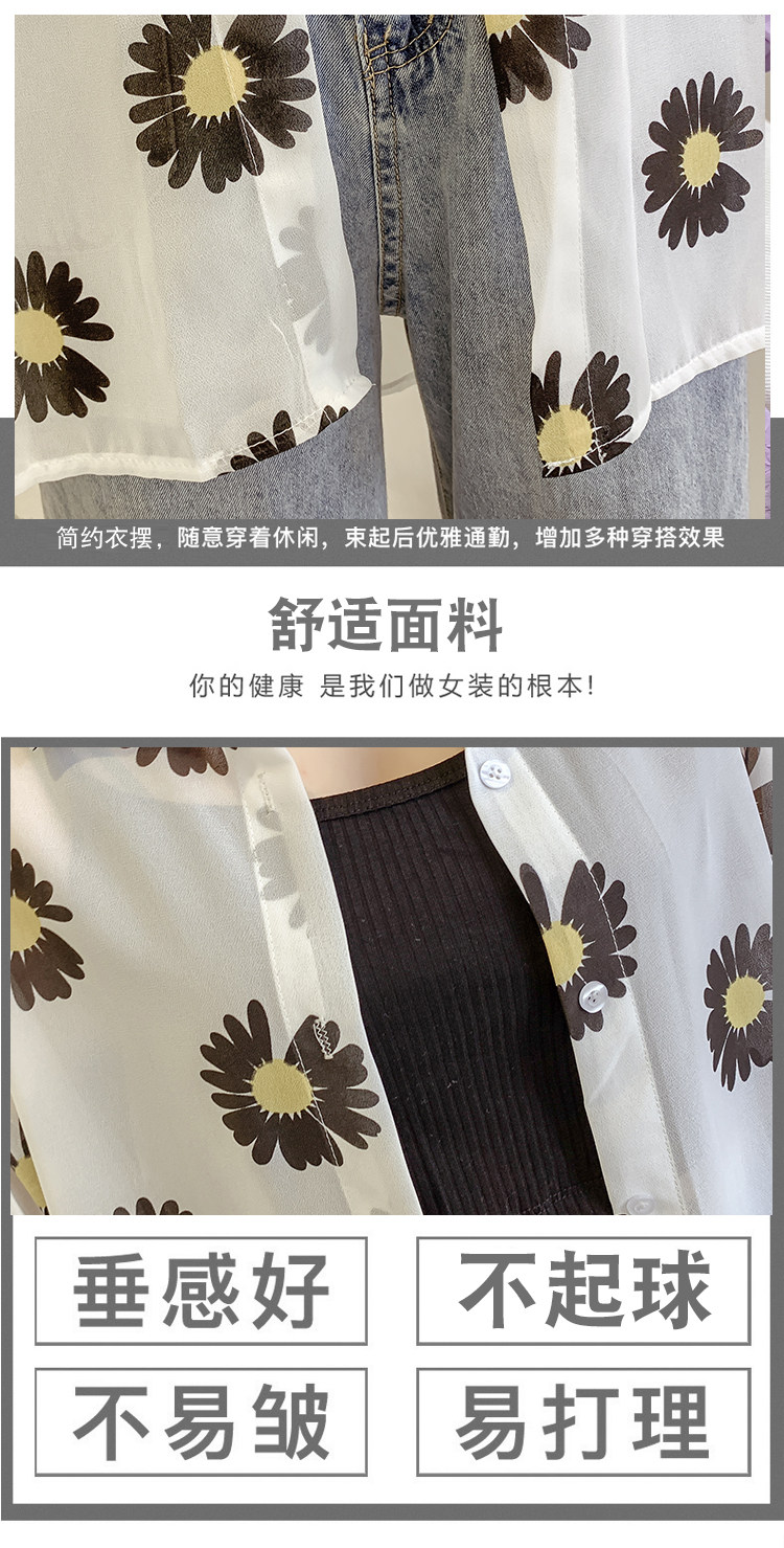 网红小雏菊防晒衣女夏衬衫百搭中长款雪纺外套韩版宽松大码空调衫