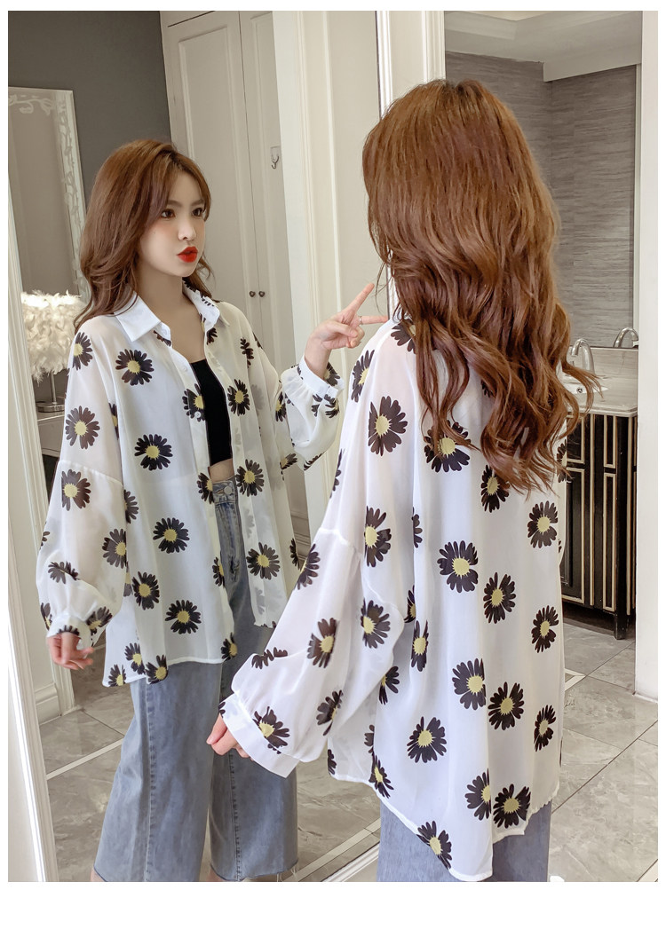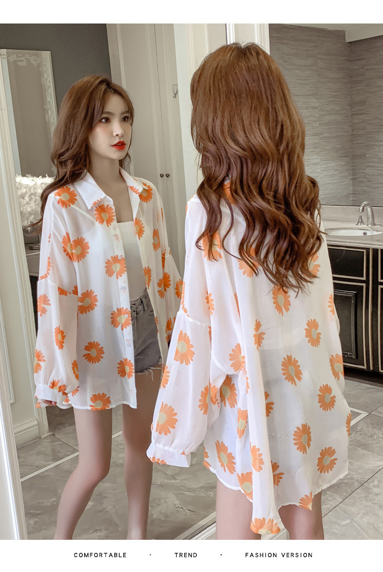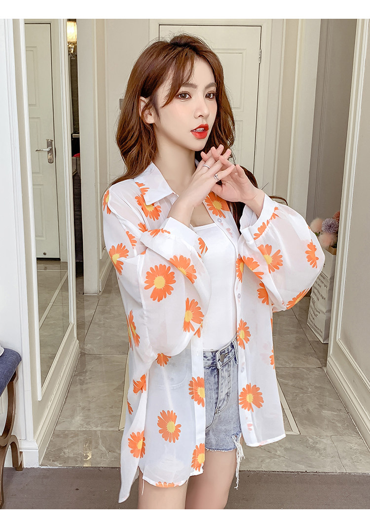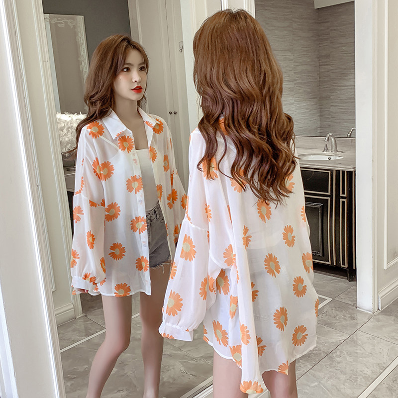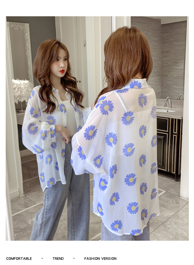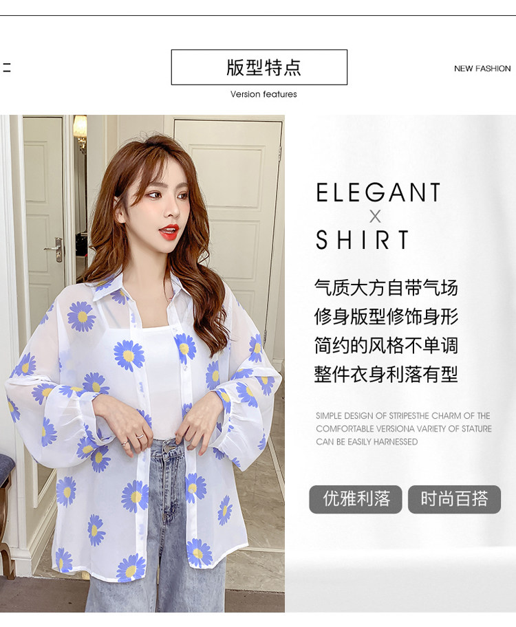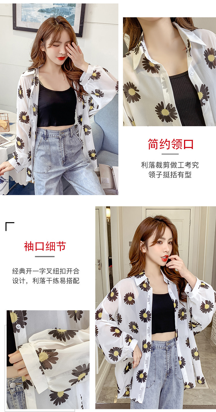 网红小雏菊防晒衣女夏衬衫百搭中长款雪纺外套韩版宽松大码空调衫