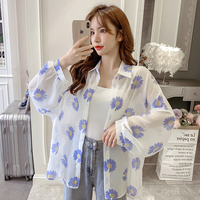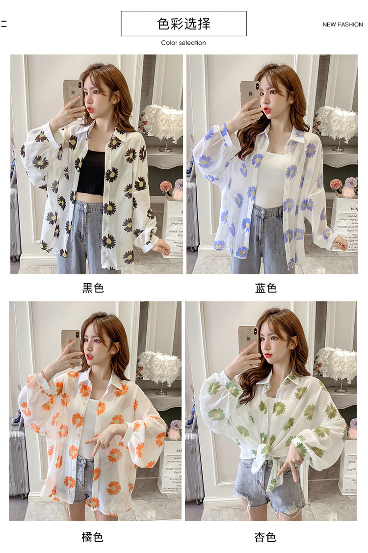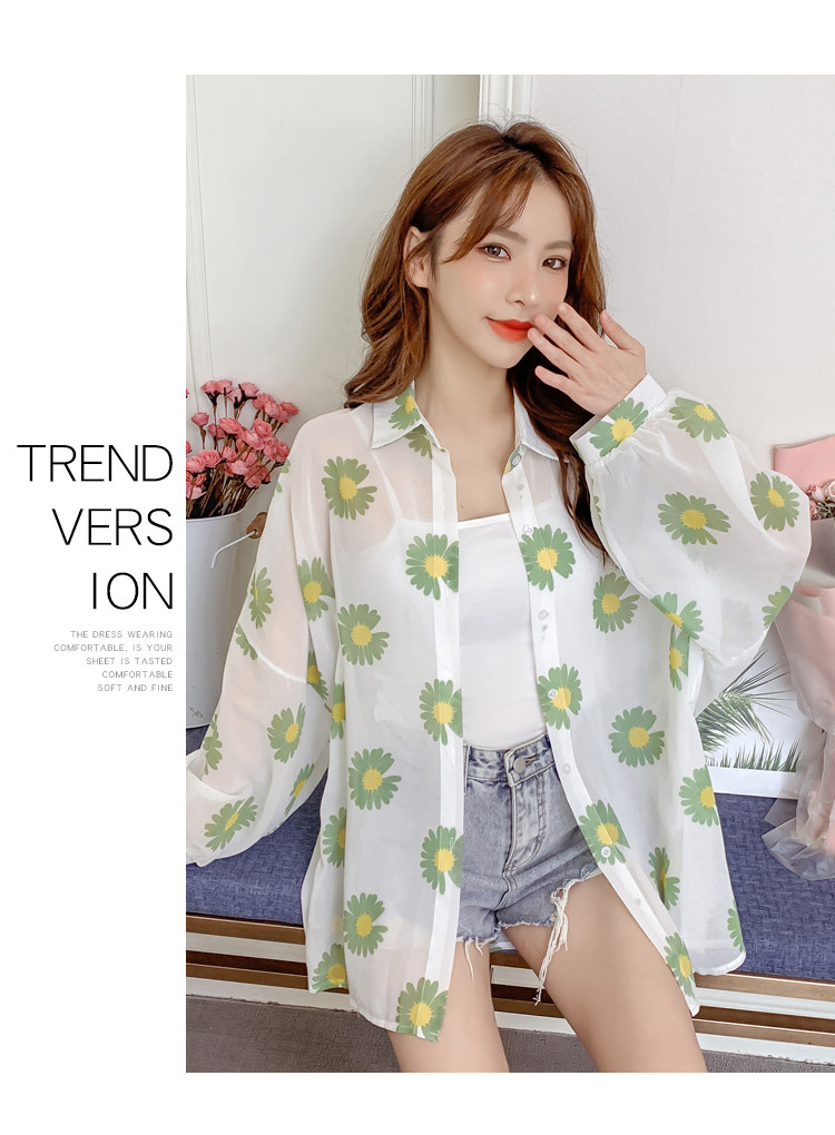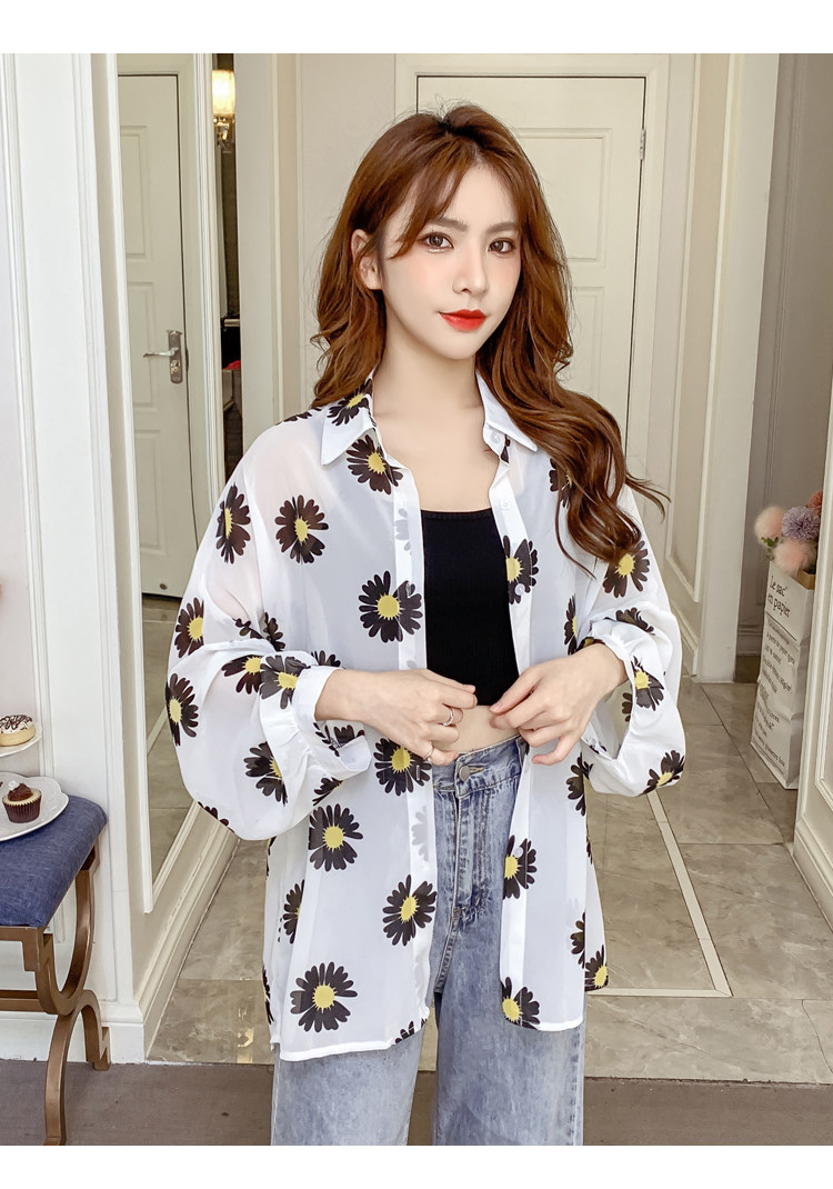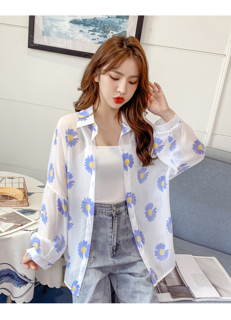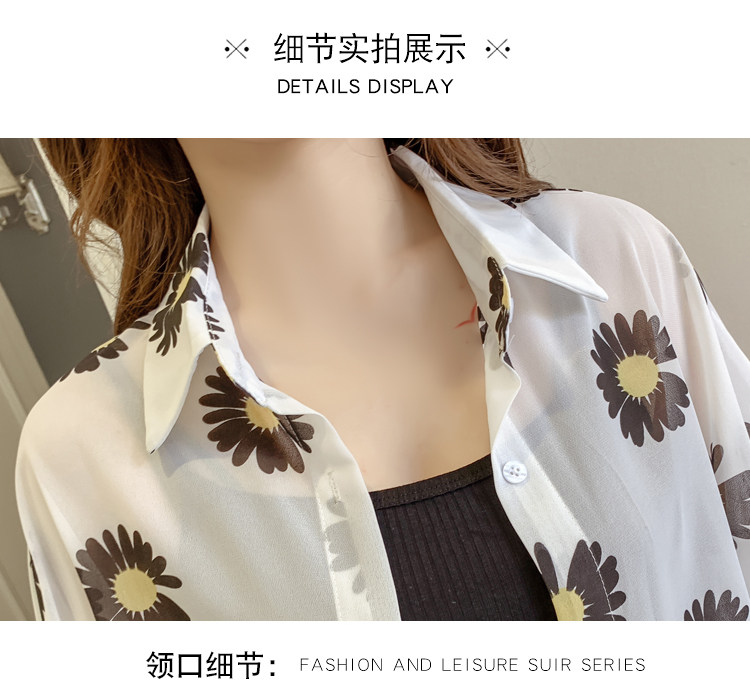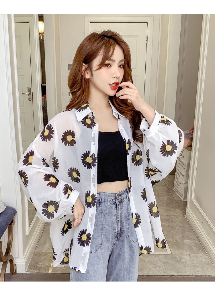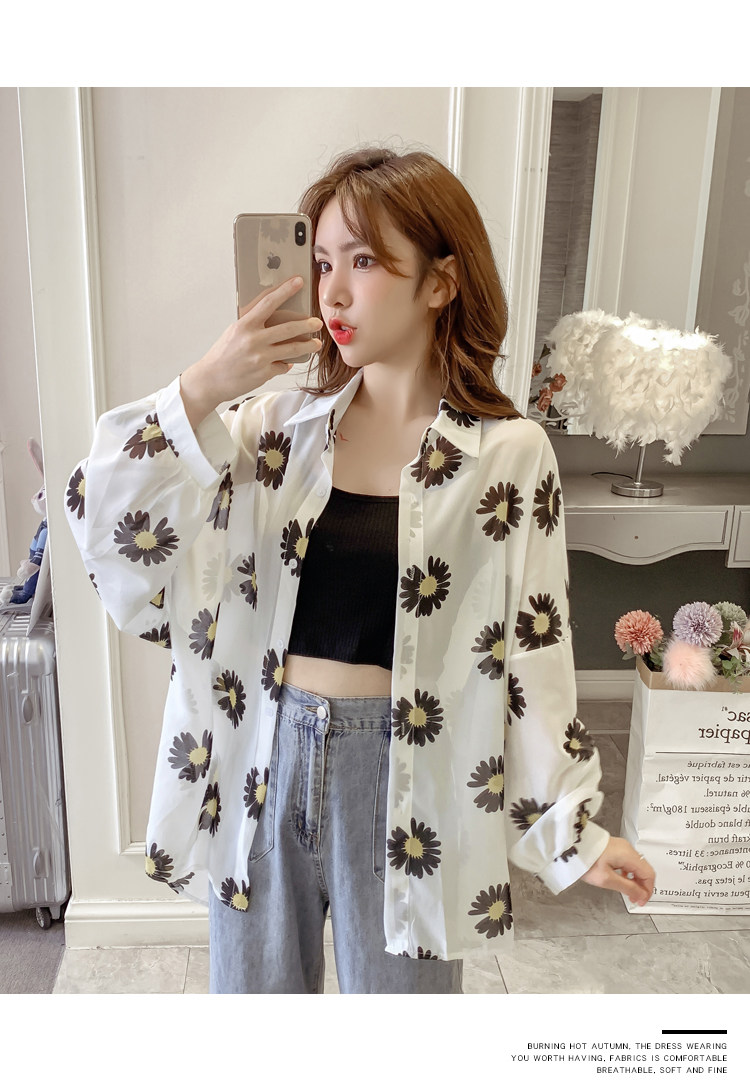 网红小雏菊防晒衣女夏衬衫百搭中长款雪纺外套韩版宽松大码空调衫