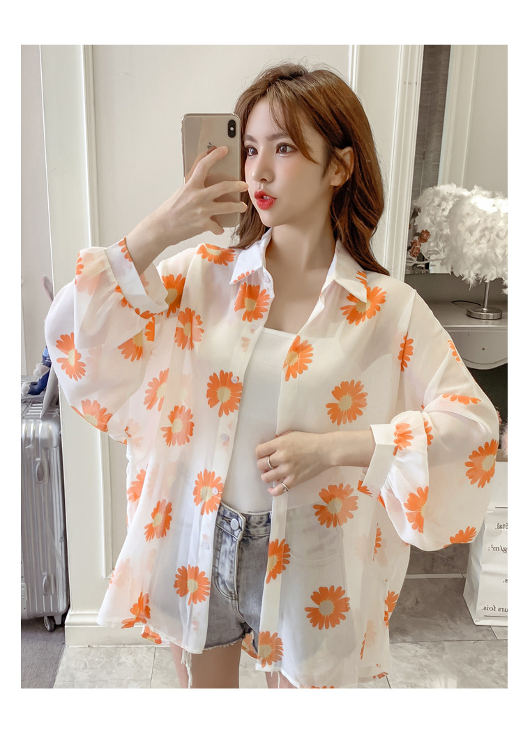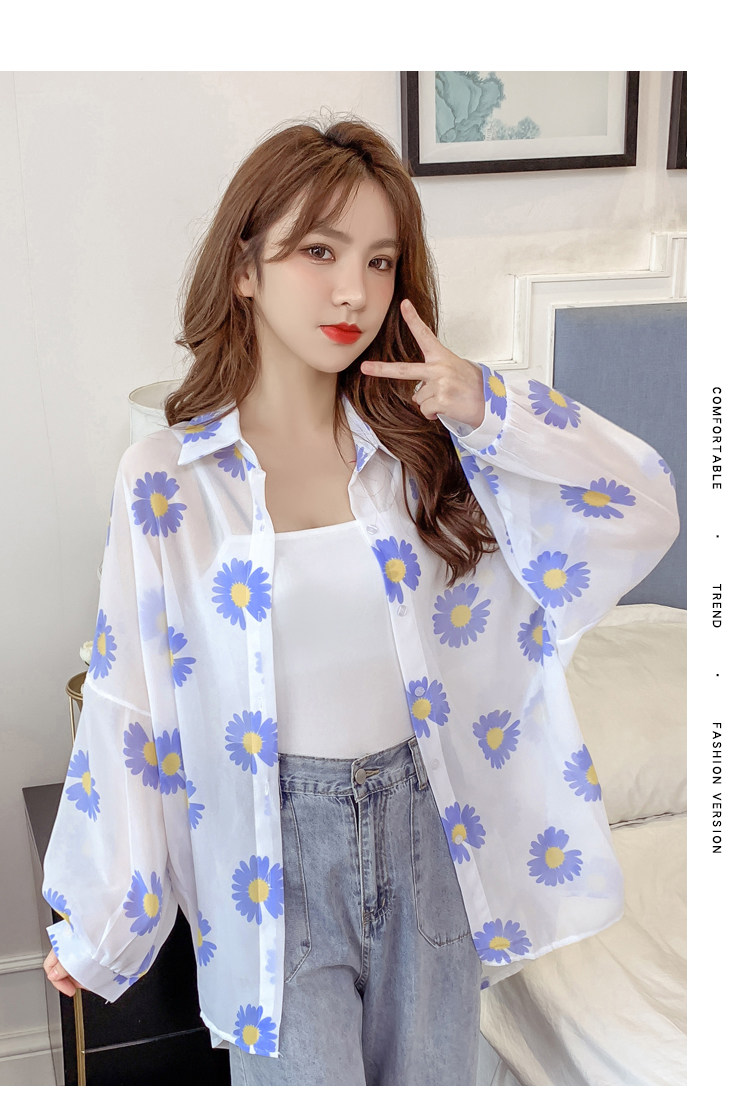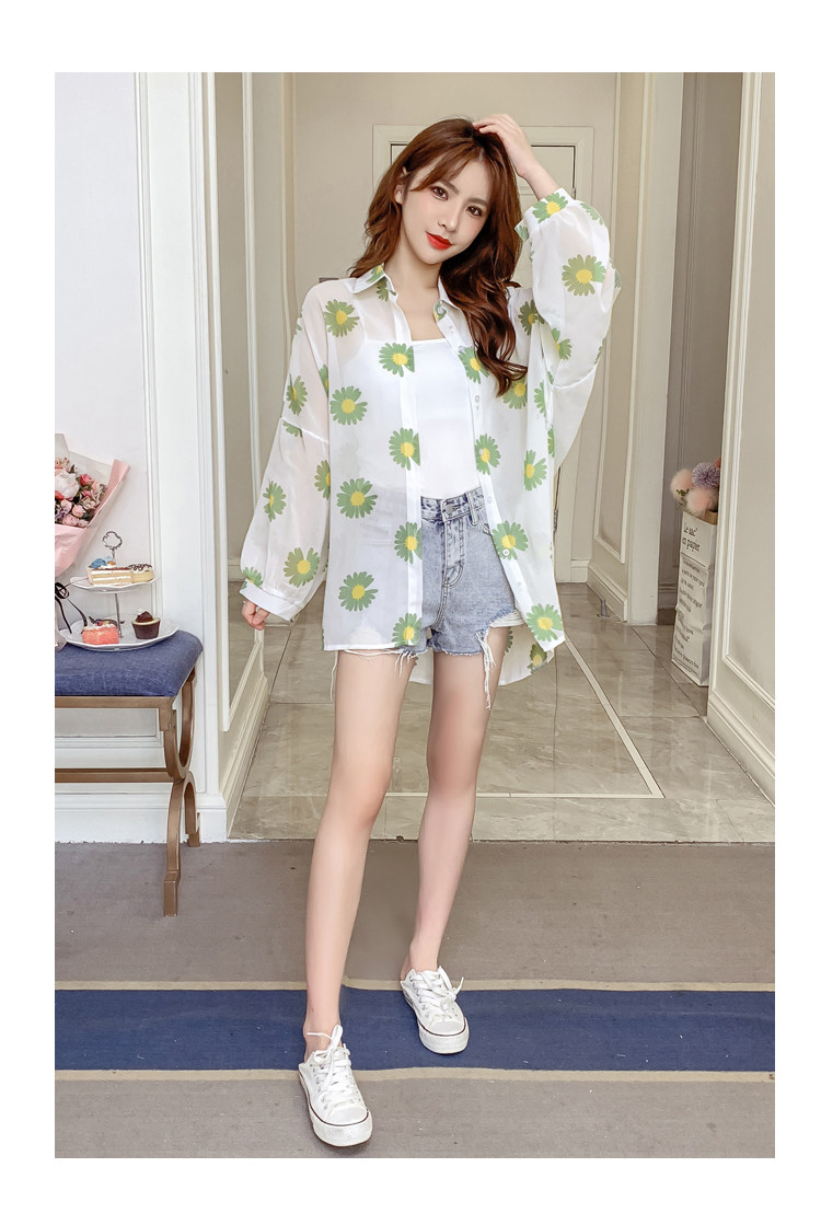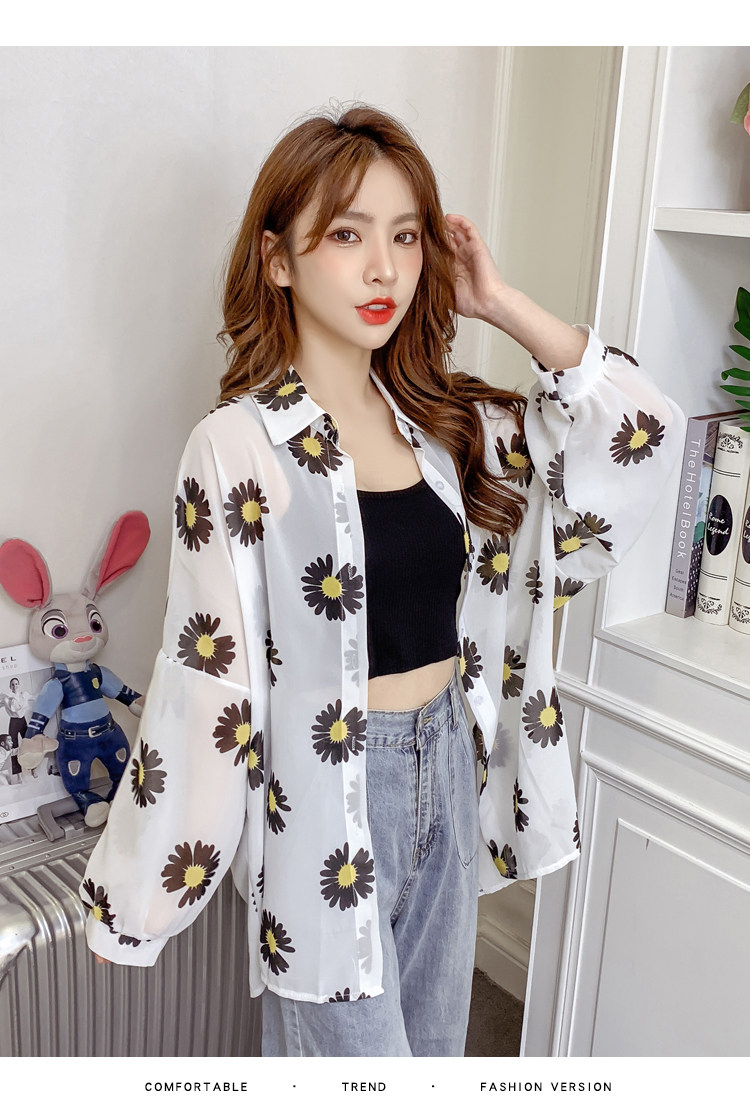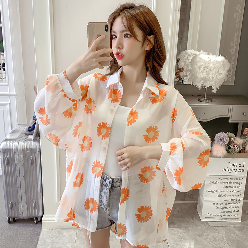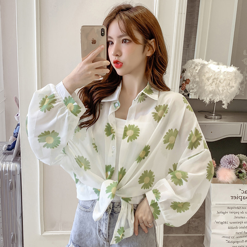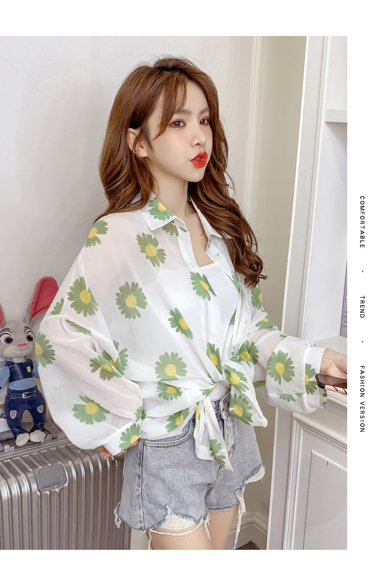 网红小雏菊防晒衣女夏衬衫百搭中长款雪纺外套韩版宽松大码空调衫