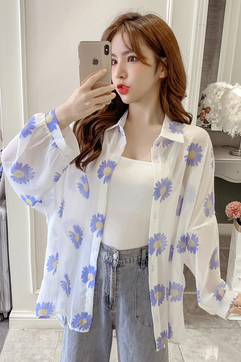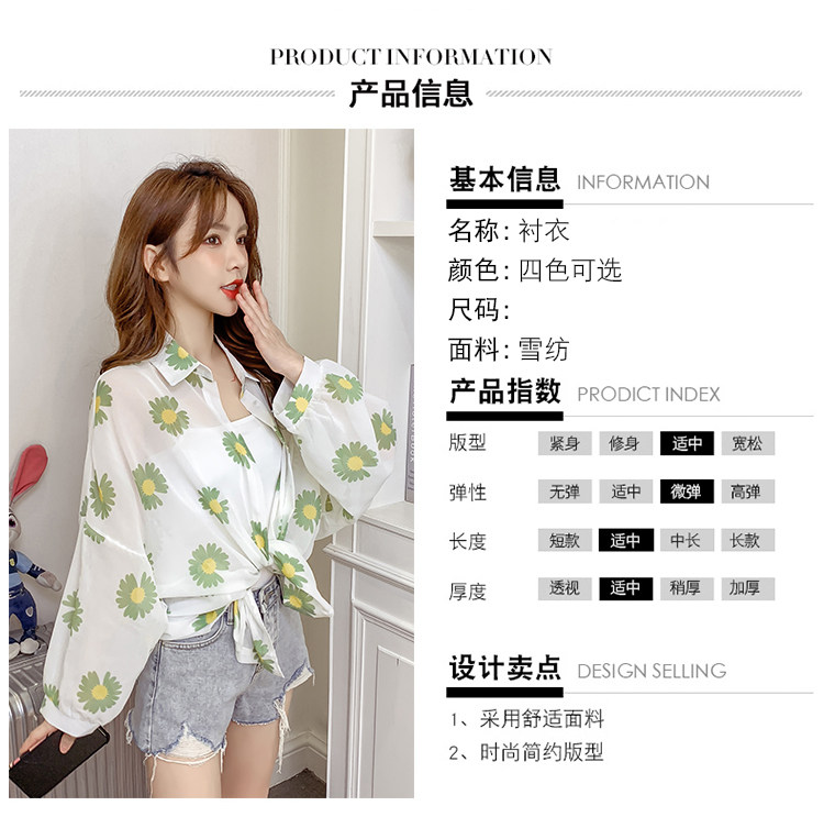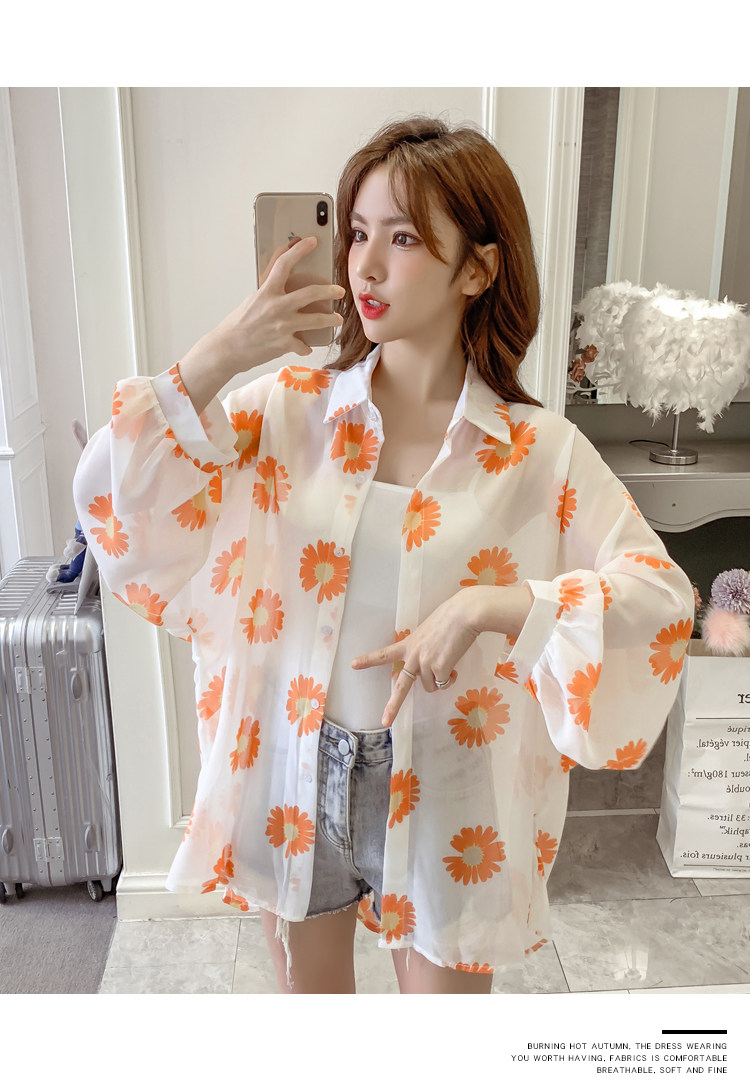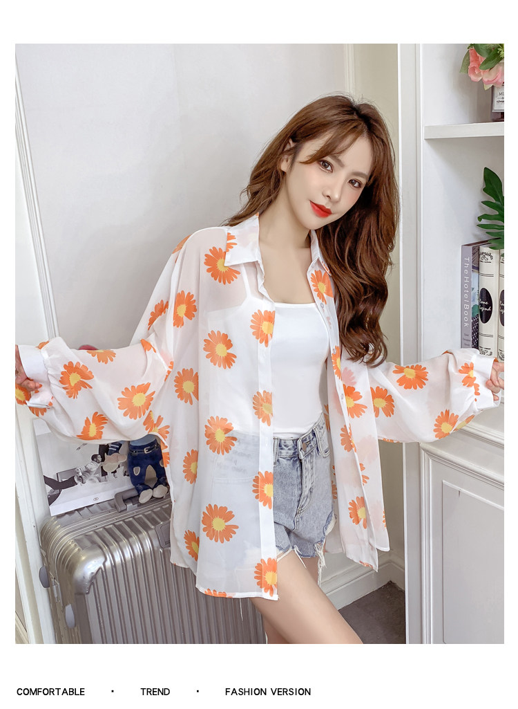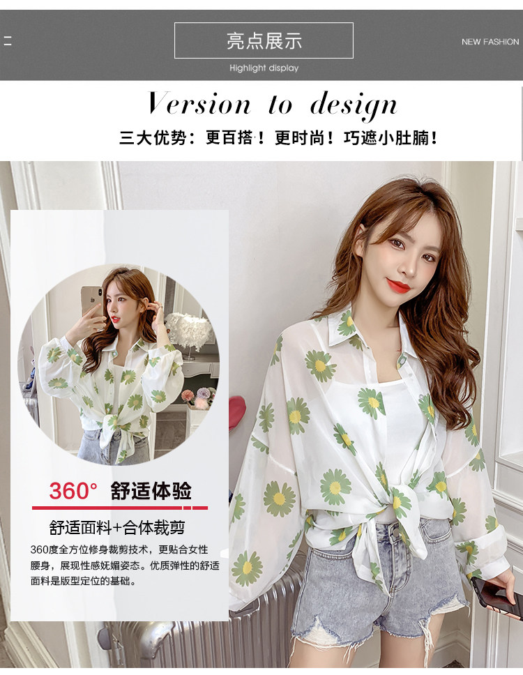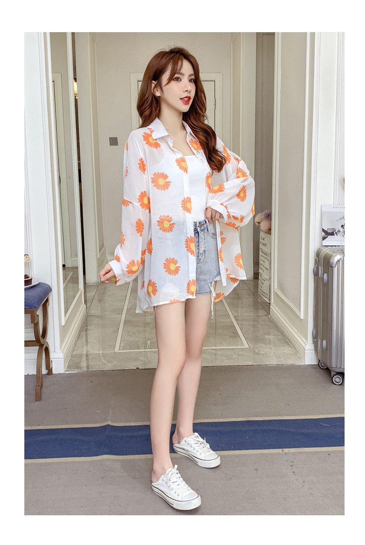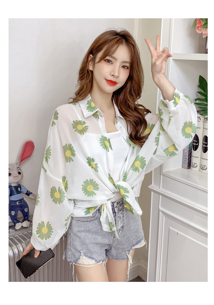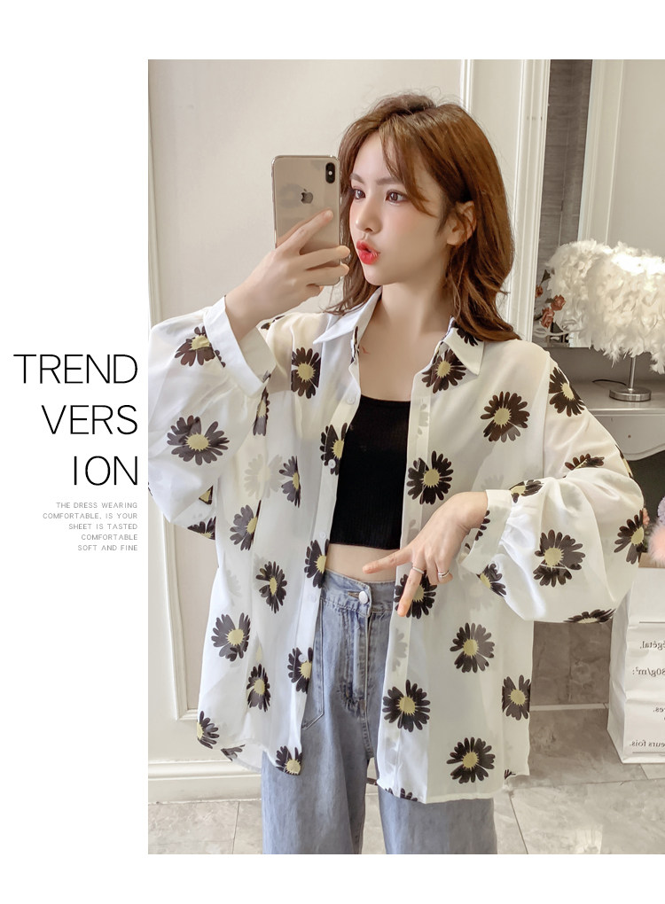 网红小雏菊防晒衣女夏衬衫百搭中长款雪纺外套韩版宽松大码空调衫