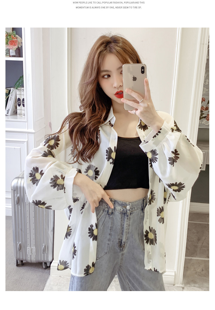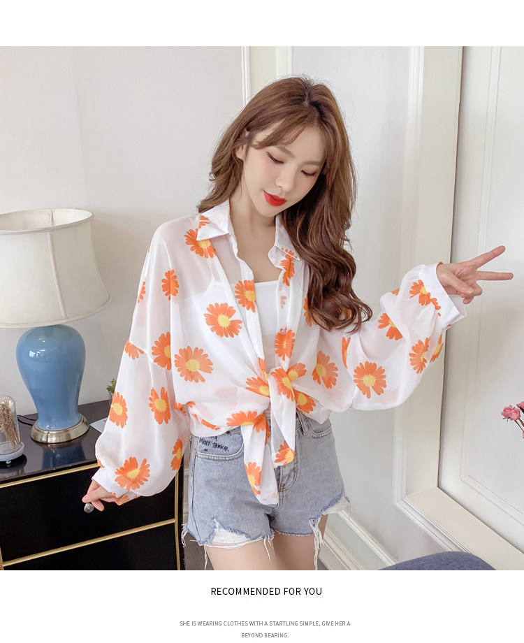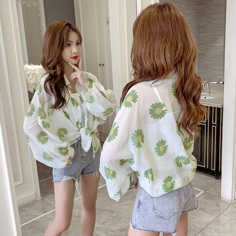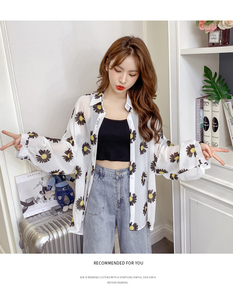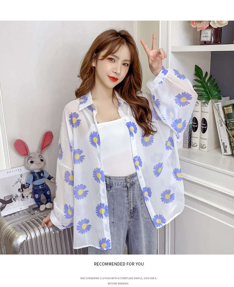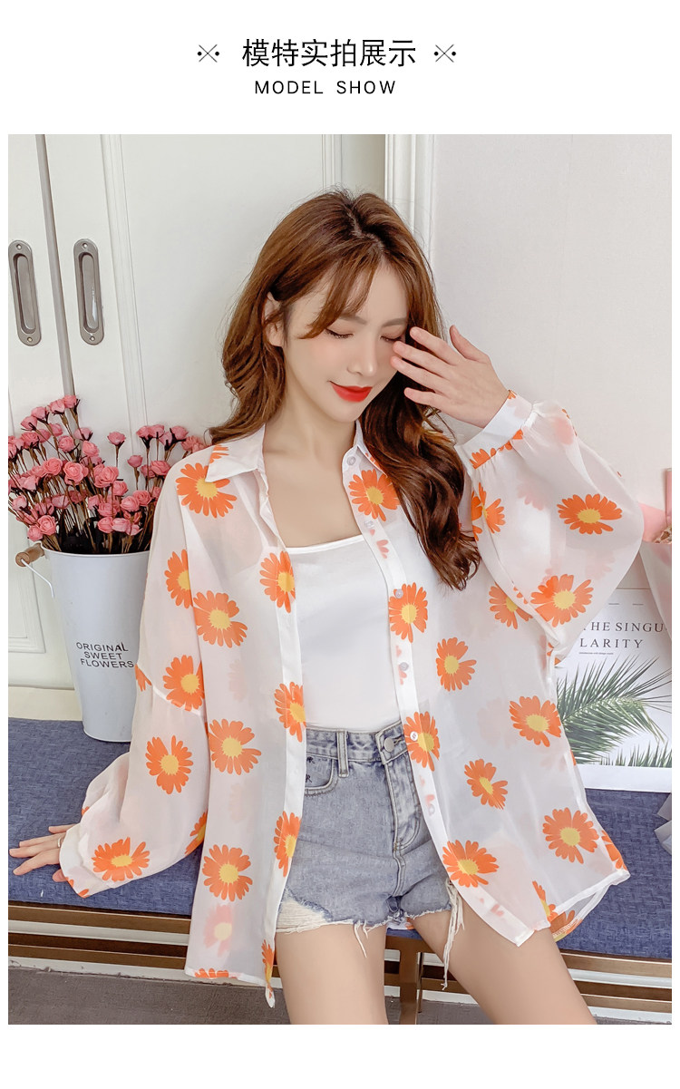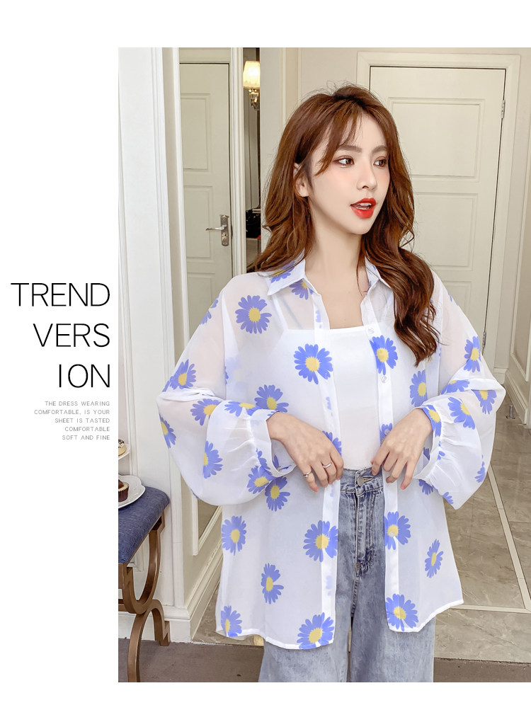网红小雏菊防晒衣女夏衬衫百搭中长款雪纺外套韩版宽松大码空调衫