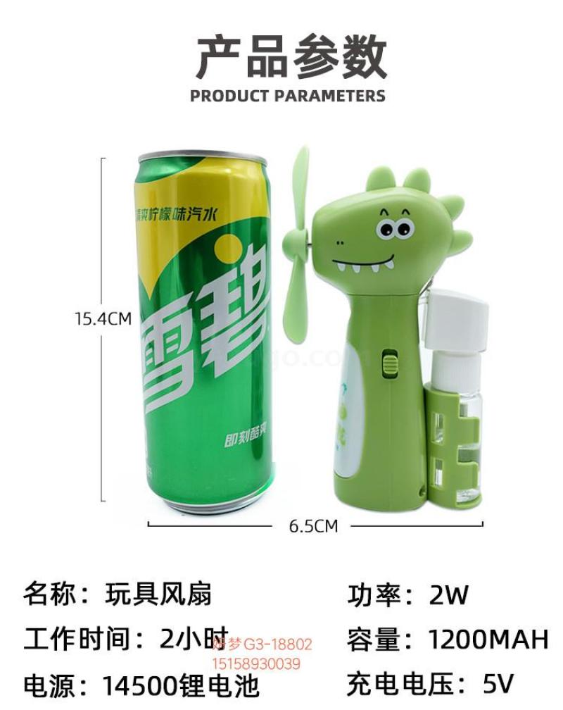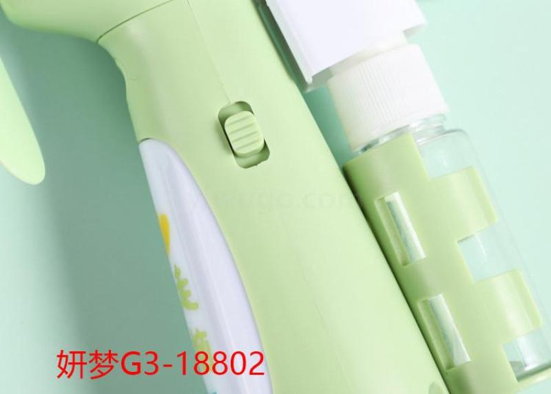 【产品备注】:一档风扇,二挡小夜灯,带有喷水壶,按压式可喷水。内置充电池采用USB充电,充电3小时左右。可持续送风1小时左右,手持携带方便,大风力夏日清凉必