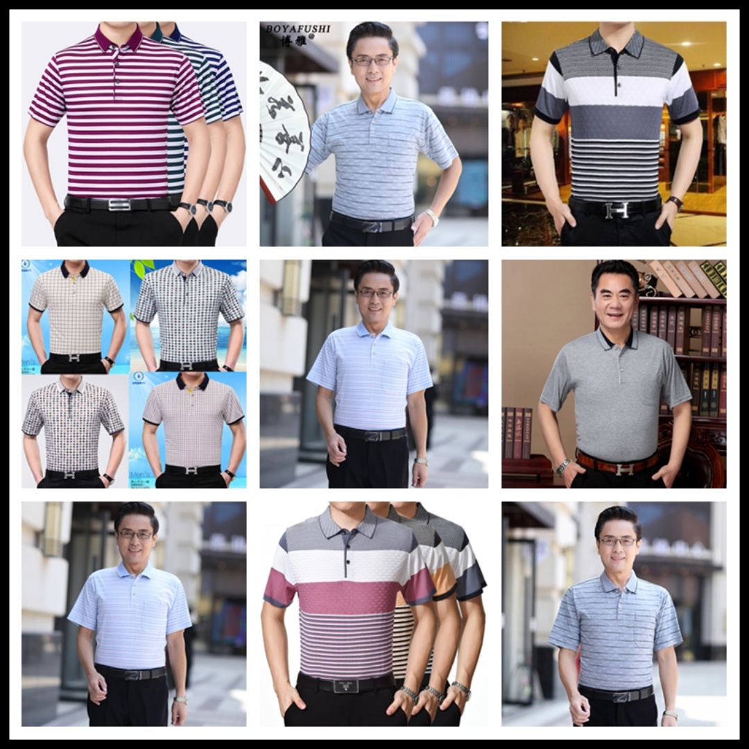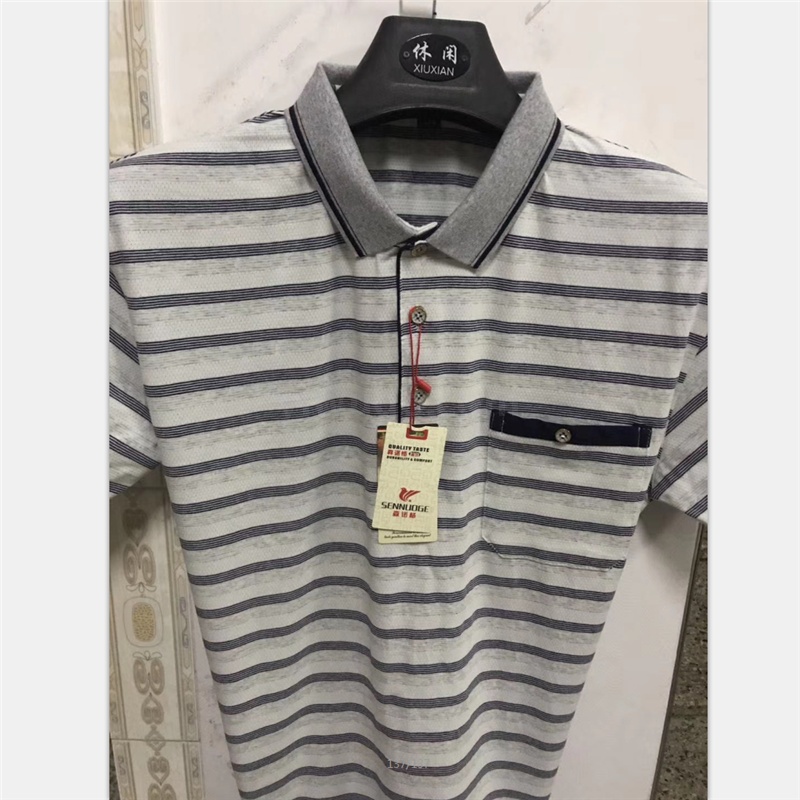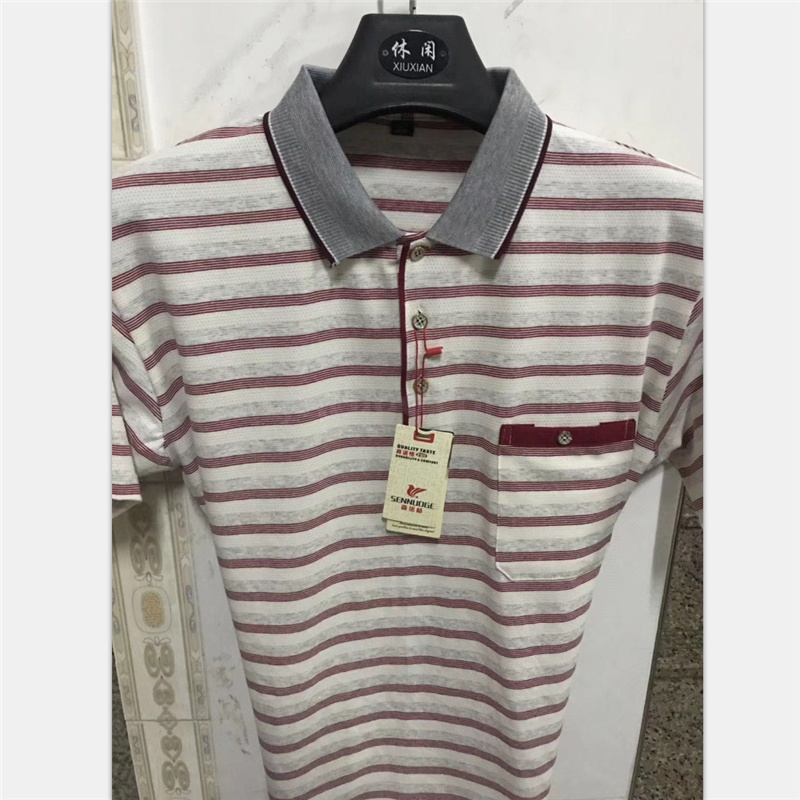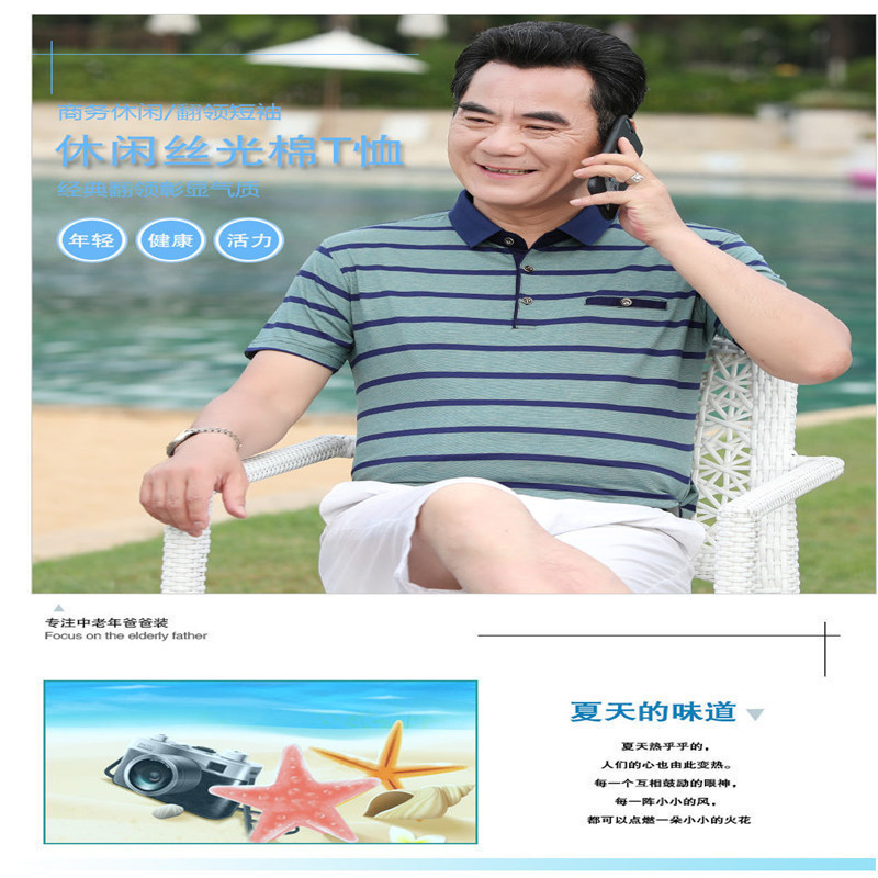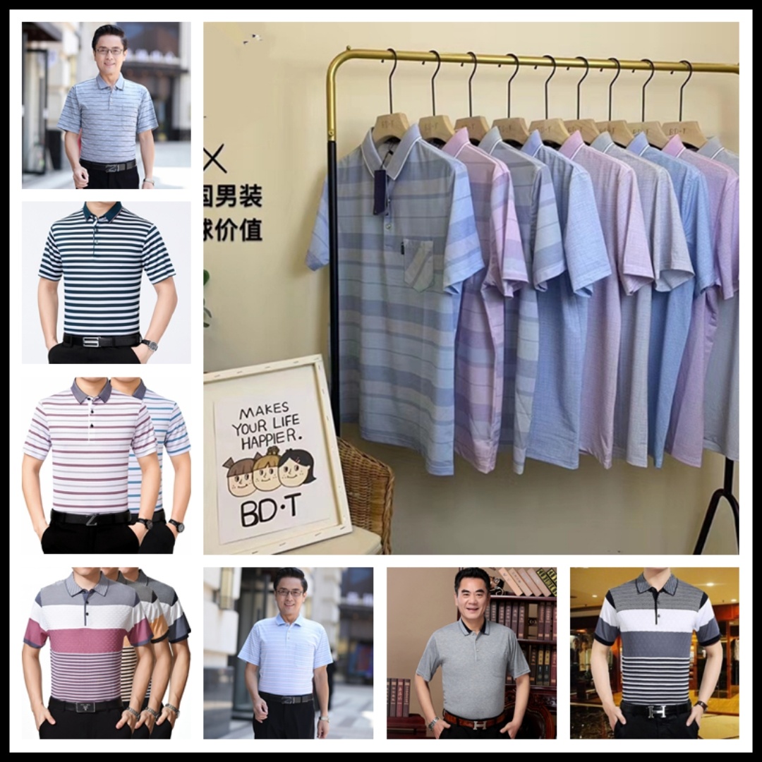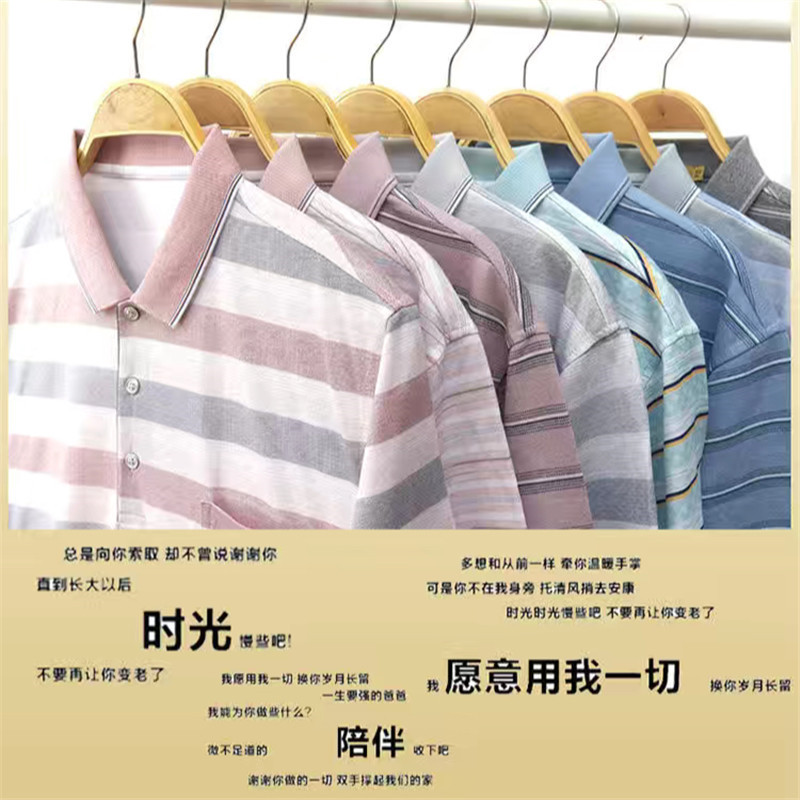 2025短袖男士商务休闲翻领口袋t恤中老年棉条纹工厂直销爸爸装