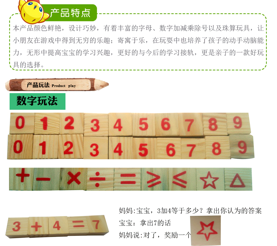 本款玩具包含了26个英文字母大小写,0至9的数字,加减乘除大于小于等于的