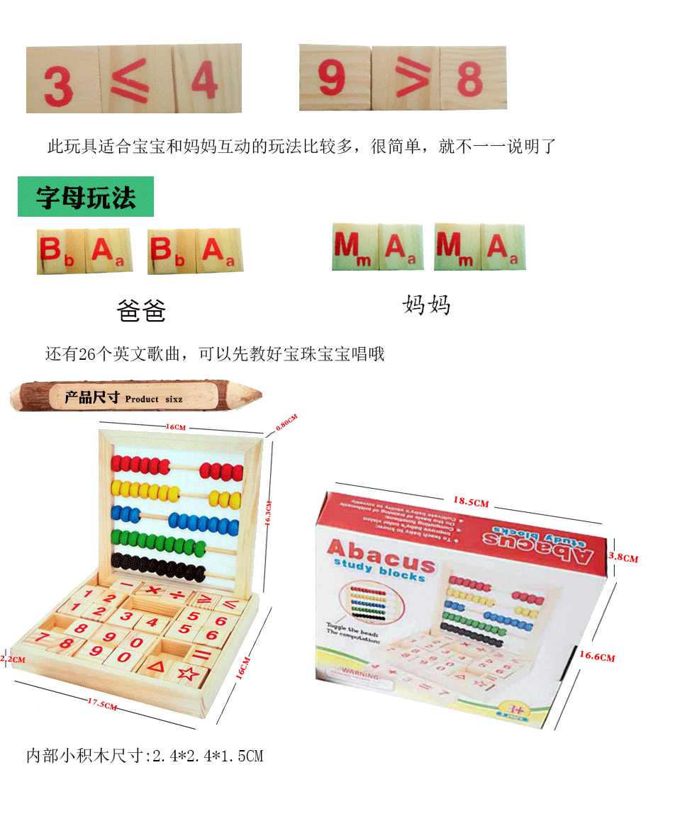 计算符号及一个珠算架,内容丰富,是亲子早教的好玩具。每件88个