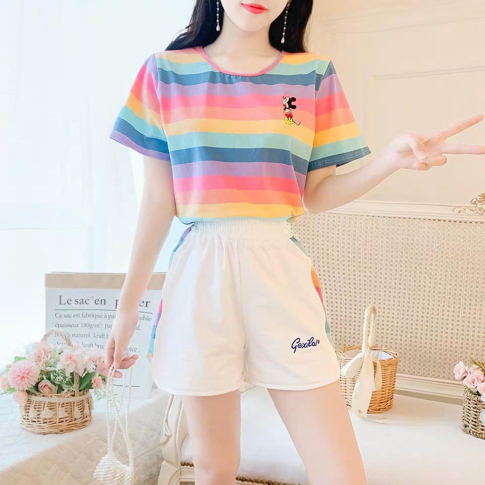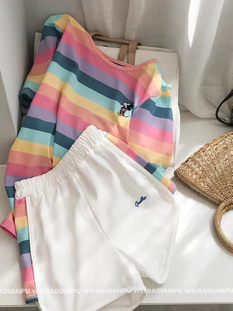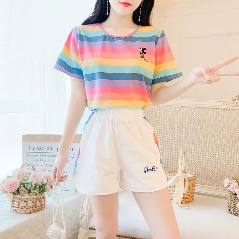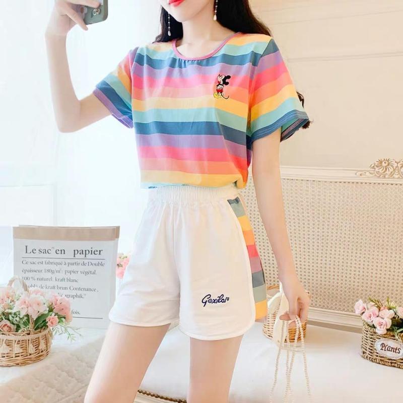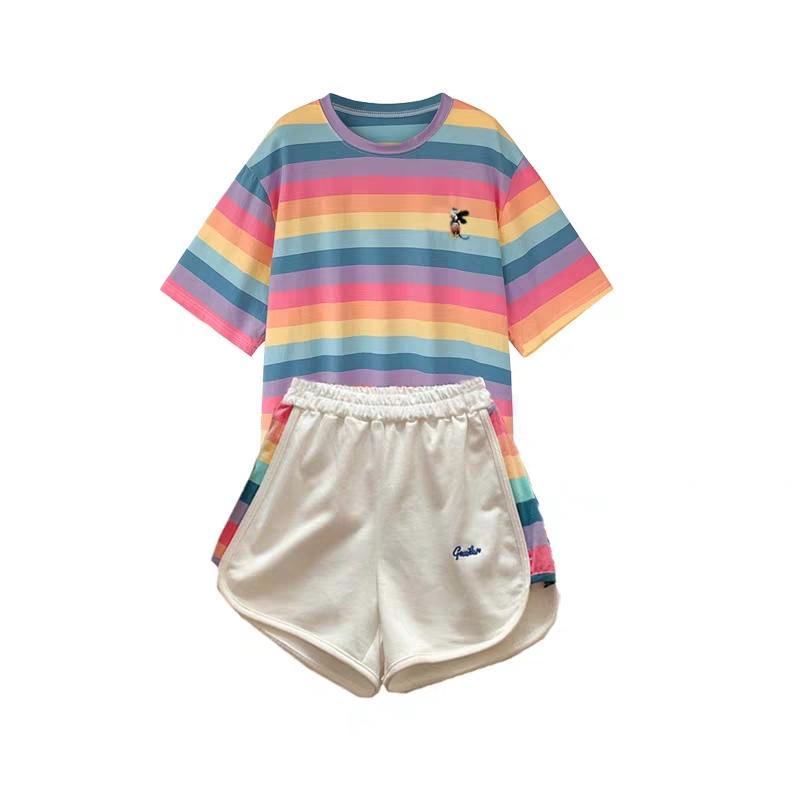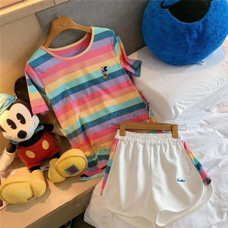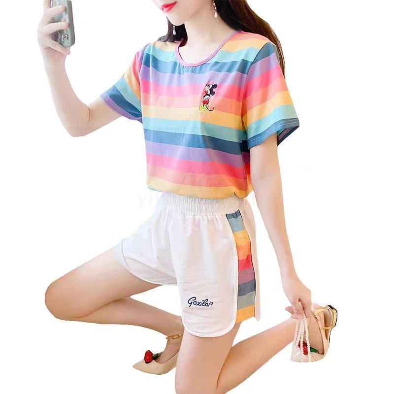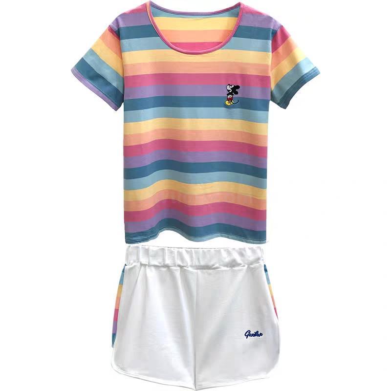 小米奇彩虹套装女士圆领t恤短袖短裤两件套夏季短袖短裤