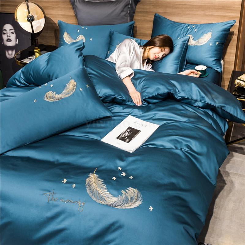 新品40s喷气贡缎全棉刺绣四件套 亲肤舒适纯色羽毛系列套件-羽