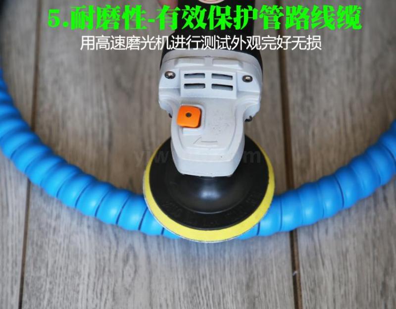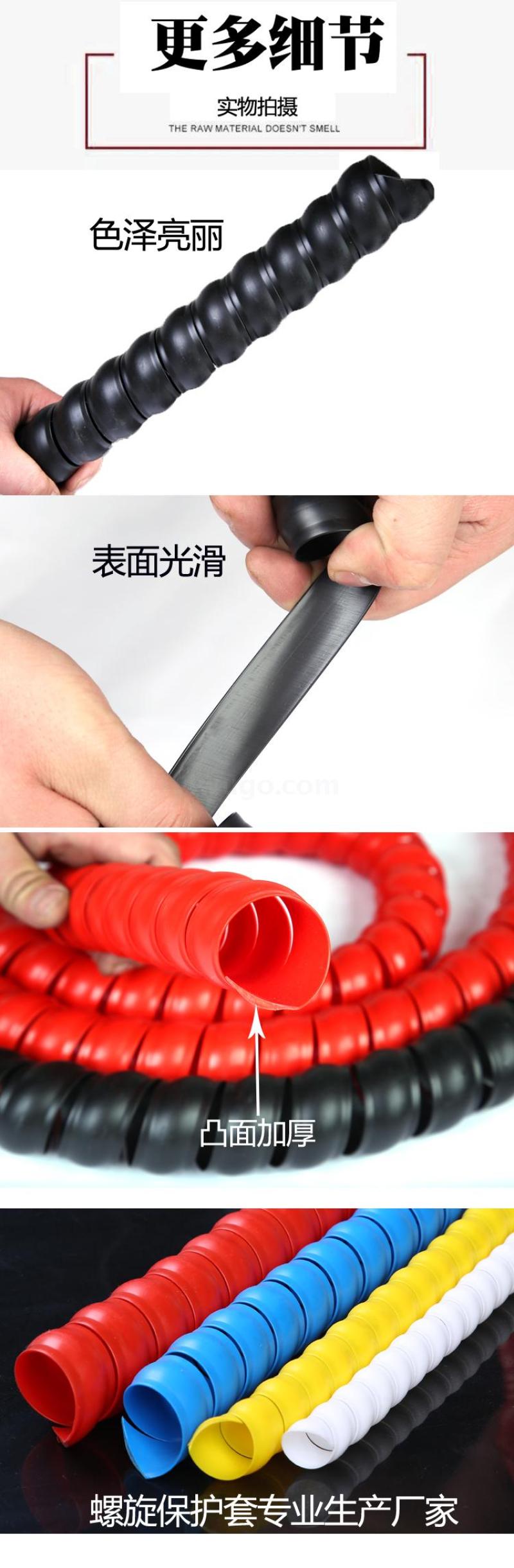 用途:螺旋保护套是一种替代传统胶管保护用金属护簧的新产品;与传统的金属护簧产品相比,胶管保护套安装简便,耐磨性更好;抗老化、抗腐蚀性能强;更能有力的对液压胶管、电线、电缆等产品外表面进行防老化和抗磨擦保护;具有更优异、更便捷、更环保节能的效果。