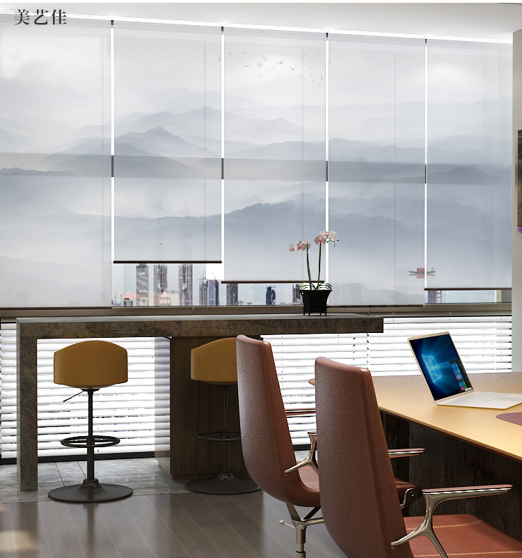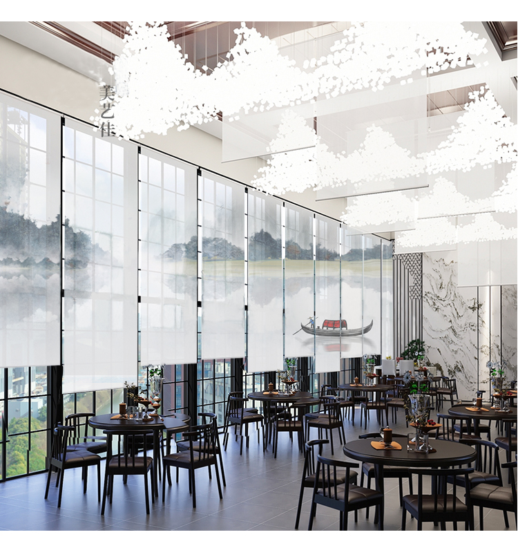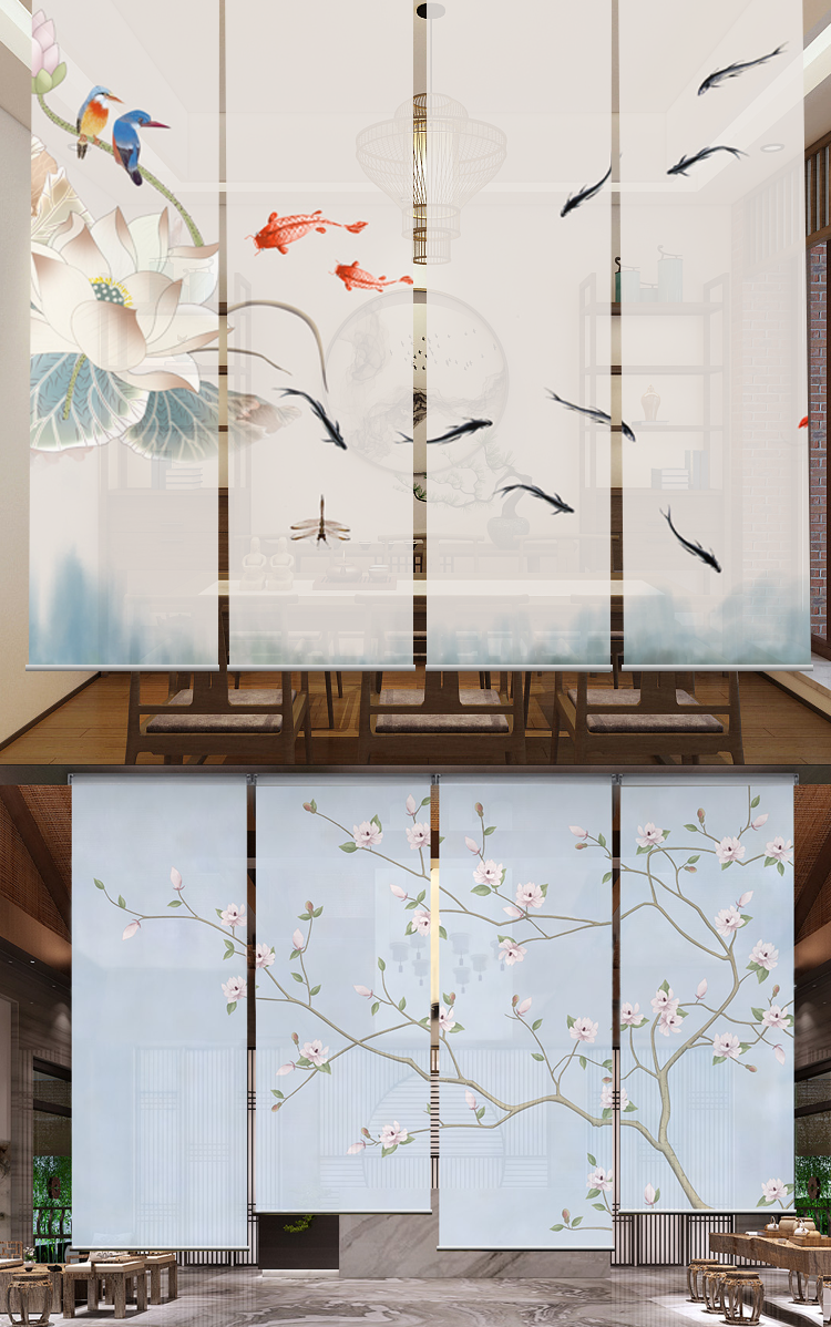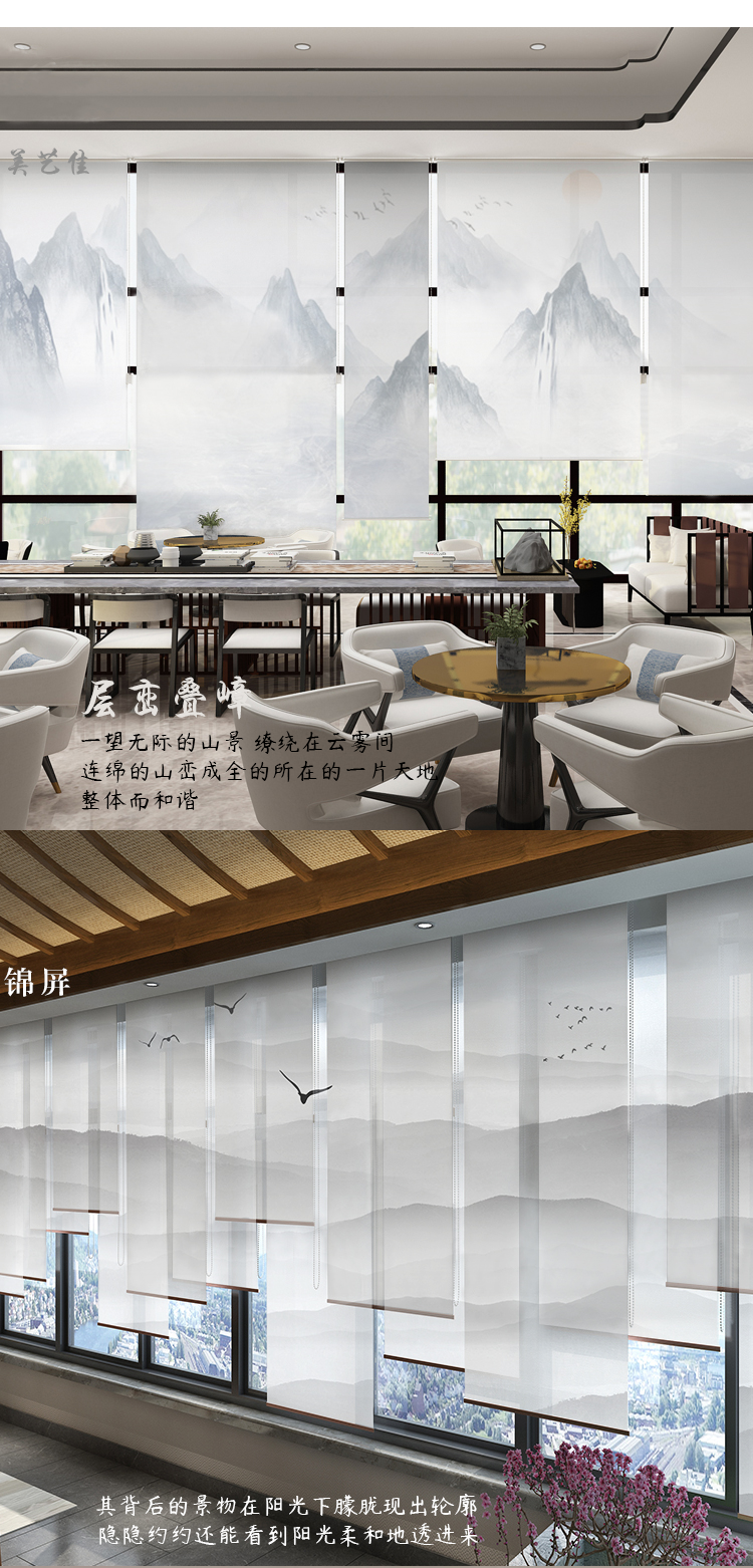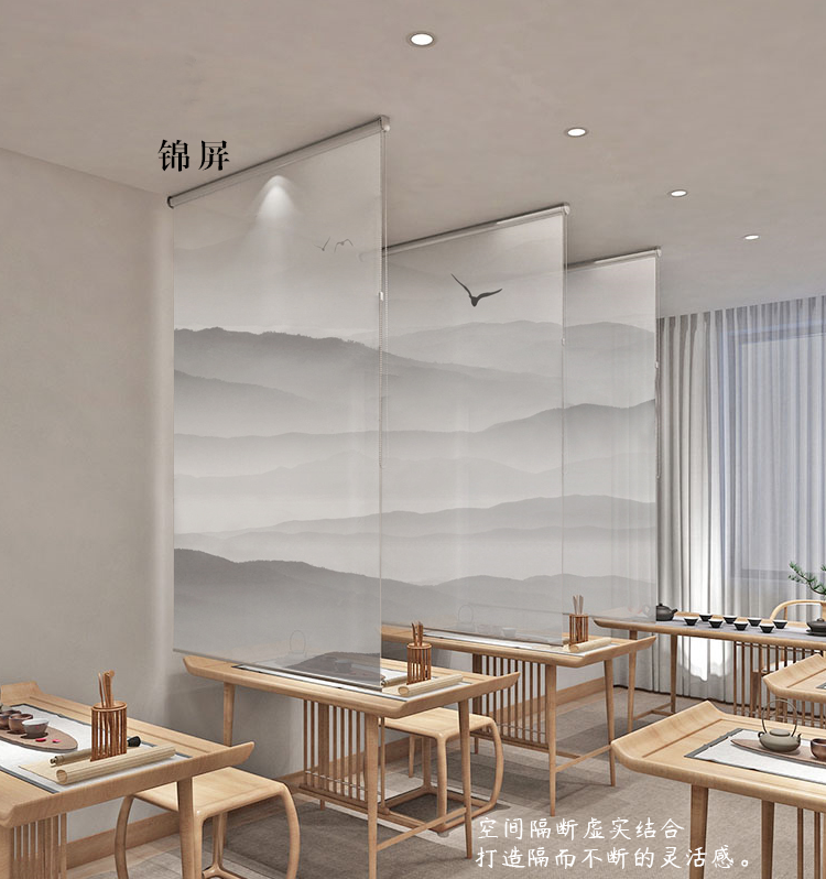 办公室山水画水墨画遮光卷帘半透明窗帘悬挂式软屏风隔断玄关挂帘