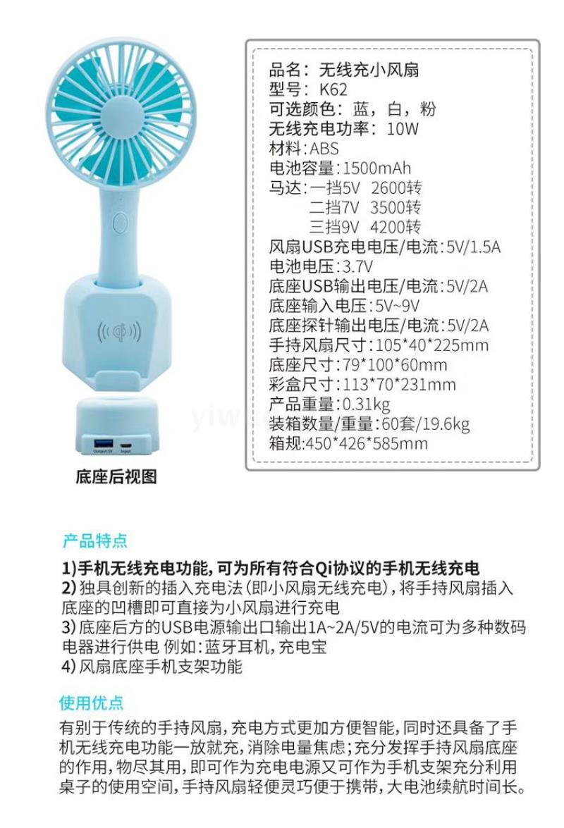 设计:底座具有给风扇无线充电功能,也可给手机无线充电,也可USB输出给手机充电
