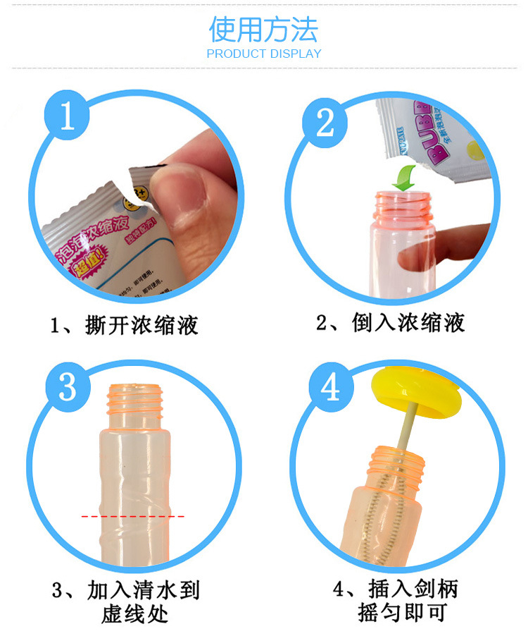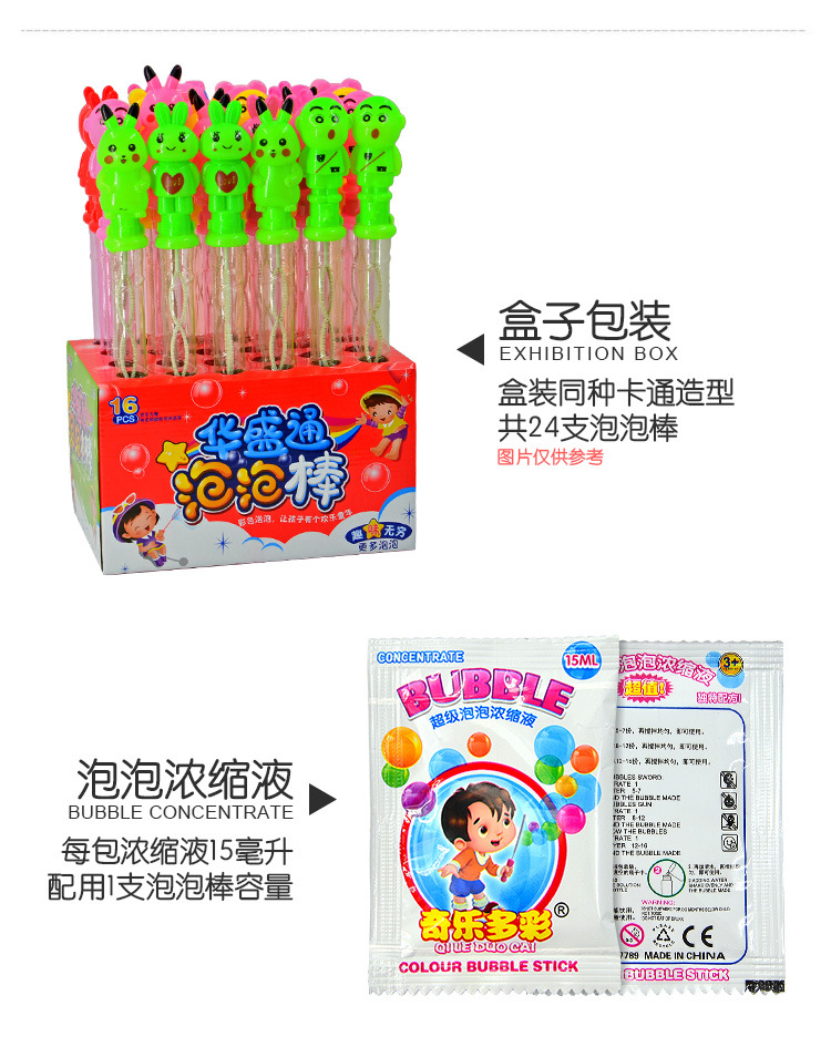 备注;这款我们是多个热卖的款式随机散装发货的哦,收到需要简单组装起来一下,然后把一包浓缩泡泡液倒进泡泡棒里面然后加水进去兑一下就好了 每根泡泡棒都配了一包浓缩液 收到货倒一包浓缩液到泡泡棒里面 再往泡泡棒里面倒满水即可 出泡效果非常好的哦!