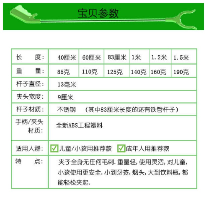 宝贝总长83cm,采用加厚不锈钢材质,把手夹头采用全新ABS工程塑料,夹头内侧还镶嵌一层TPR防滑软胶,防滑性更好,夹头跟所夹物体更稳合,不易脱落