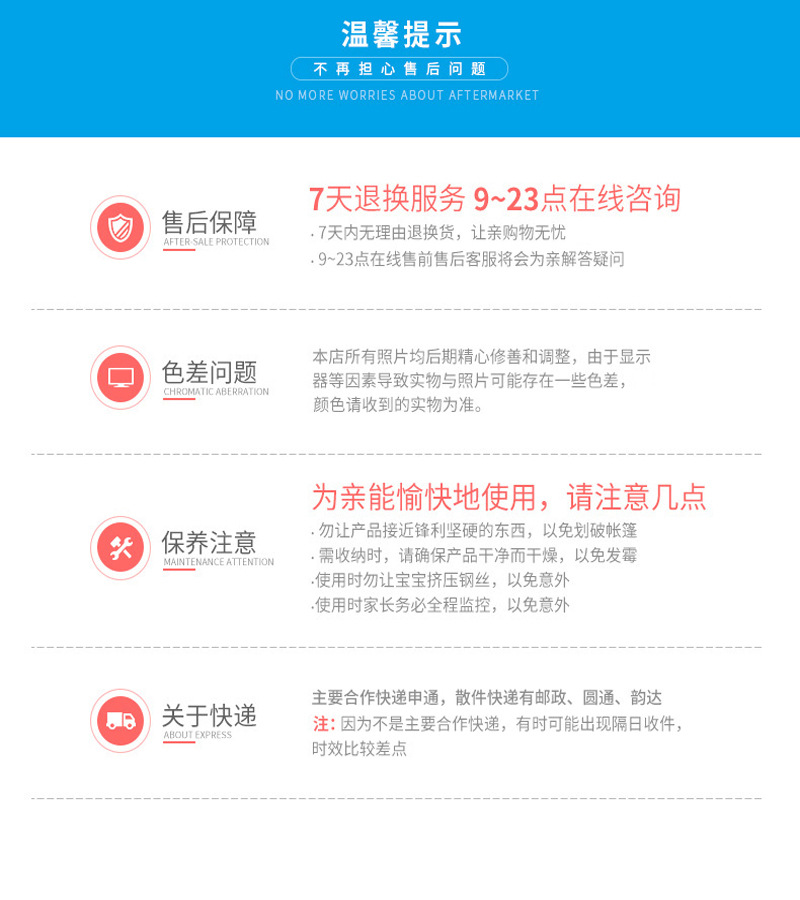 1、货物都是客户下单生产发货的,产品一般都是塑料材料为主,包装是纸质材料,在运输过程中,特别是一些长途的城市,有可能个别产品受运输损耗,(如个别受碰撞稍有划痕,如彩盒包装的个别彩盒稍有变形等),一般发“德邦物流”“佳吉”“华宇”到目前为止还没发现较严重的运输损耗,介意的买家考虑清楚再订购。。。