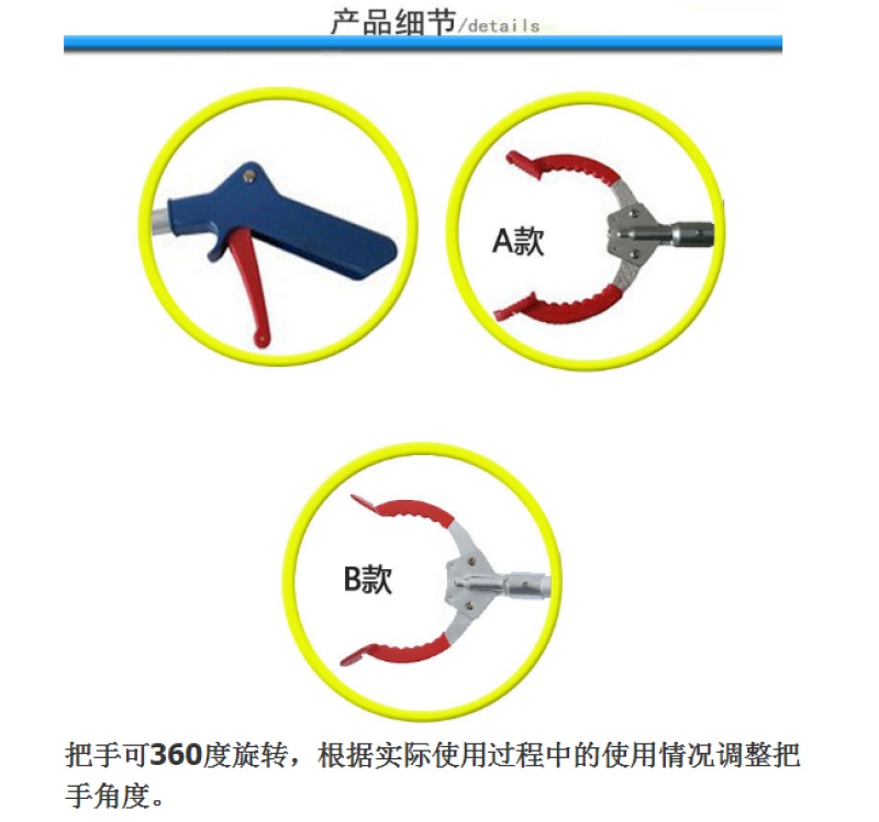 宝贝总长约92cm,采用加厚铝合金材质,夹头为高级ABS工程塑料,防滑设计,抓合力更强,不易脱落。A款夹头为注塑工艺,B款夹头为浸塑工艺。