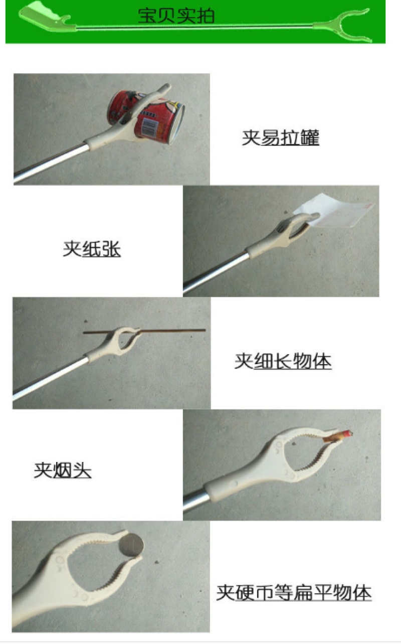 宝贝总长100cm,采用加厚不锈钢材质,把手夹头采用全新ABS工程塑料,夹头内侧还镶嵌一层TPR防滑软胶,防滑性更好,夹头跟所夹物体更稳合,不易脱落