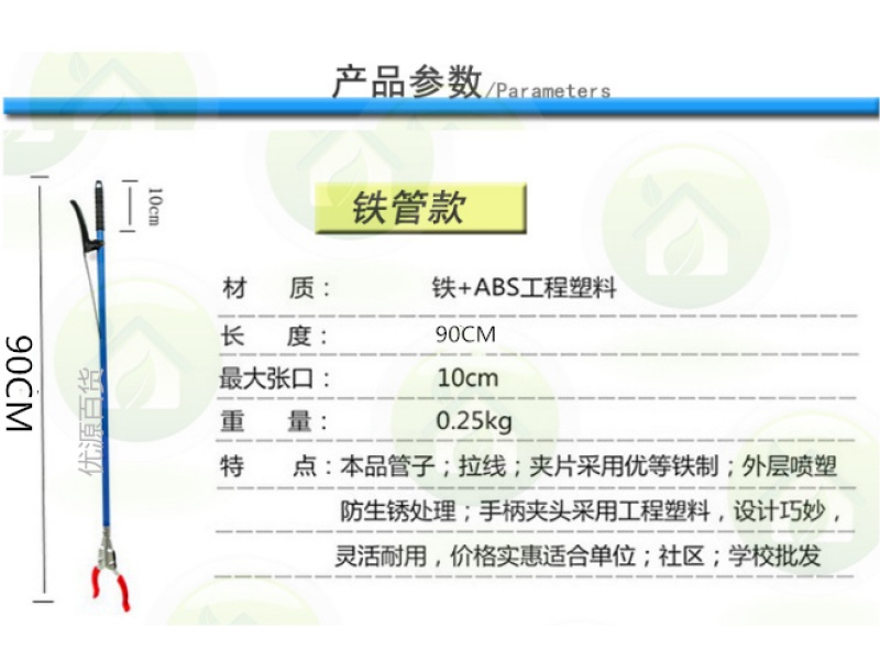 产品总长90-92cm,采用铁管材质,夹头为高级ABS工程塑料,防滑设计,抓合力更强,不易脱落,最大张开角度达到10cm以上。