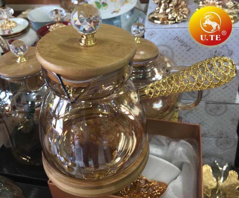 高硼硅镀金玻璃咖啡壶带木盖砖石头