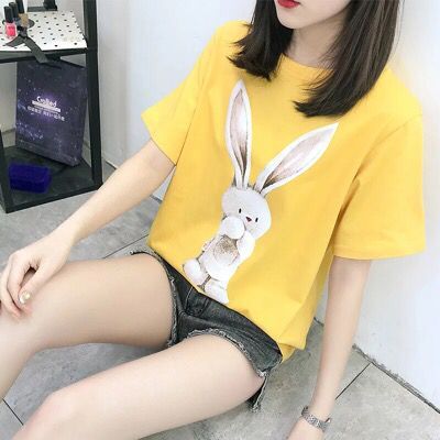 夏季兔子印花白色短袖T恤女学生宽松百搭纯棉体恤女上衣