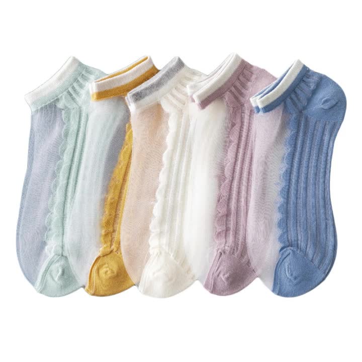 春夏花边玻璃丝袜女蕾丝拼色棉底竖条卡丝短袜透明水晶丝船袜地摊