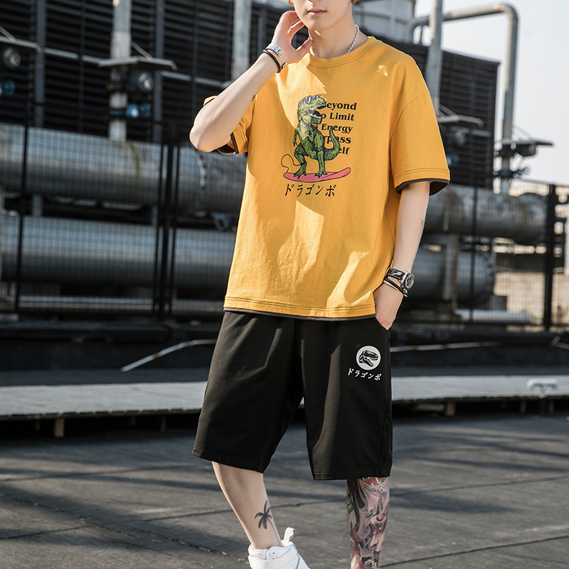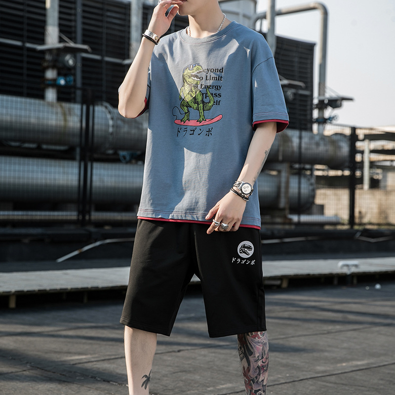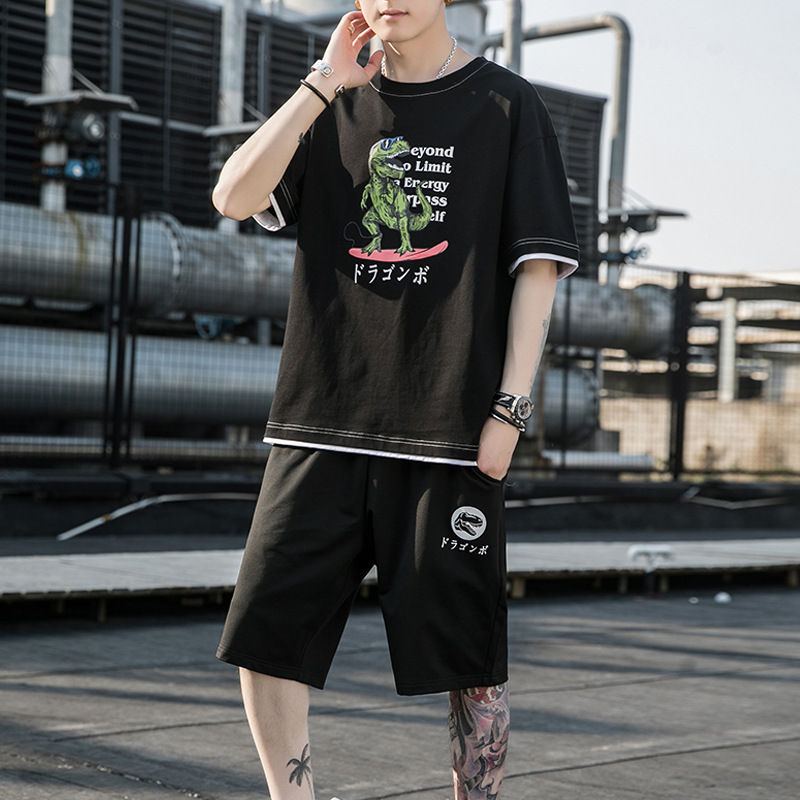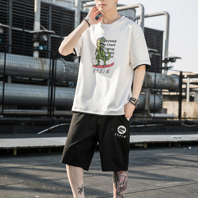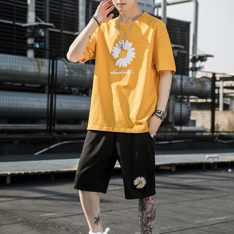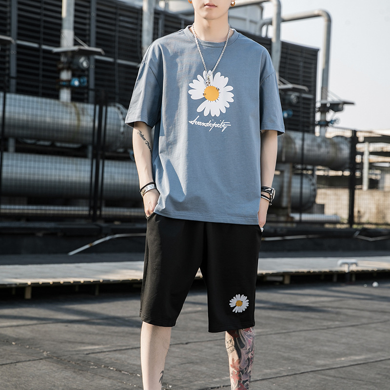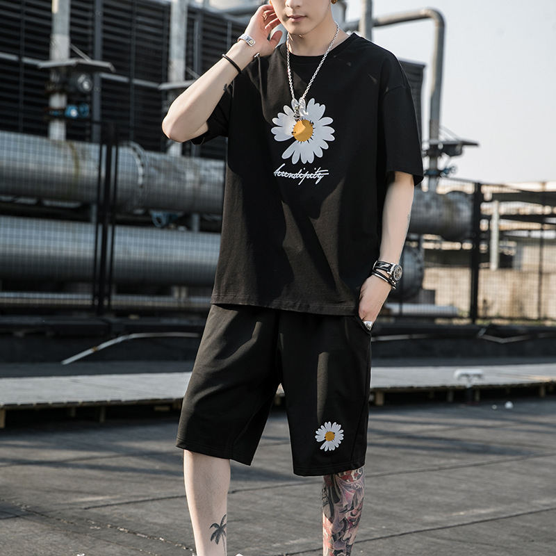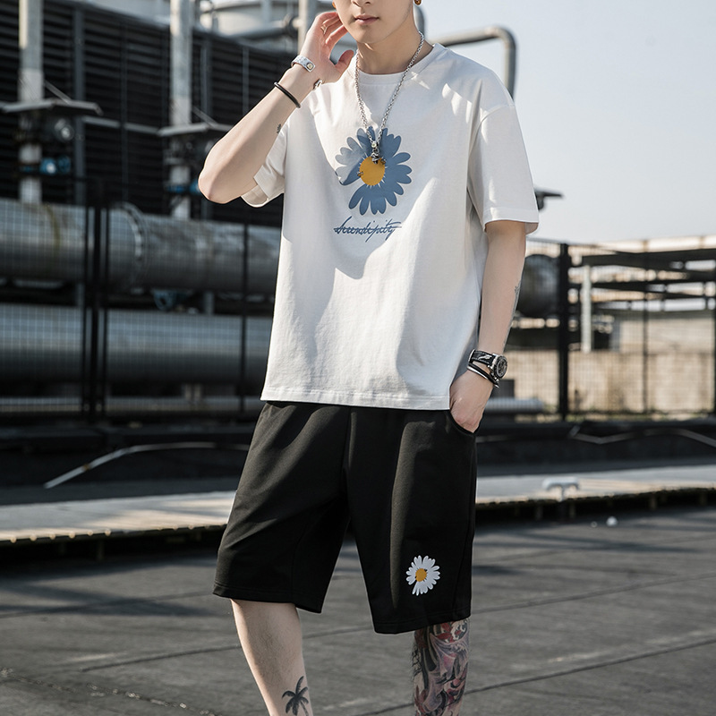 夏季休闲短袖套装男新款韩版潮流雏菊印花T恤运动夏装两件套