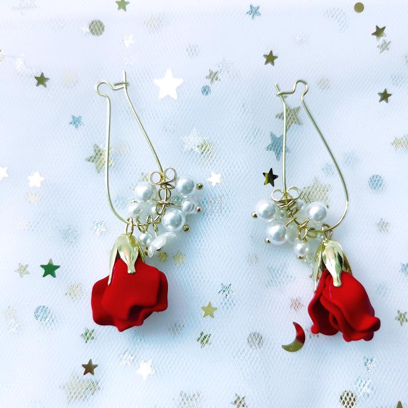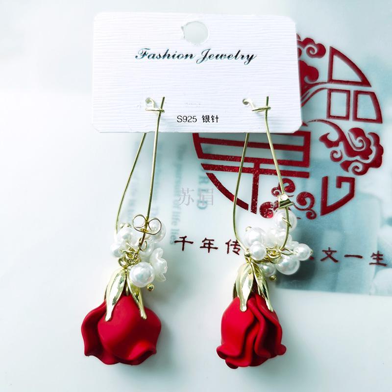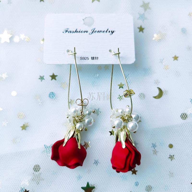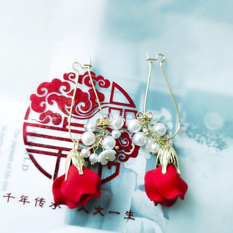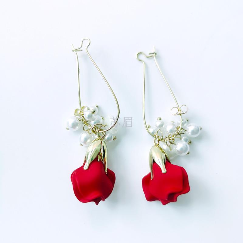 时尚玫瑰花瓣耳环女珍珠流苏耳扣耳坠耳饰长款气质高级感法式网红