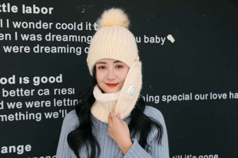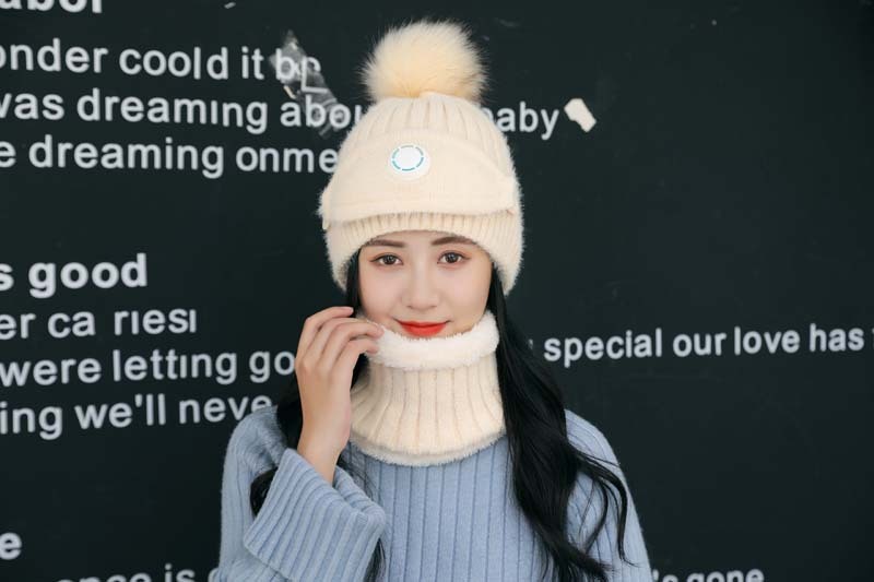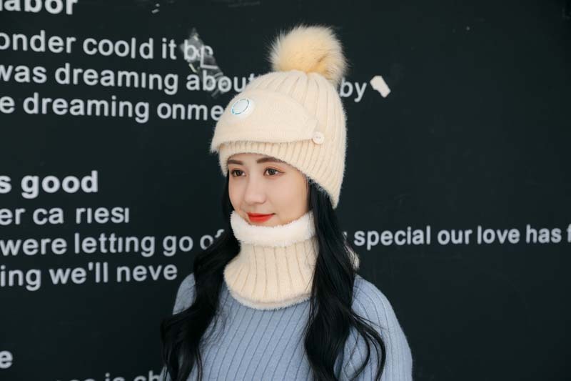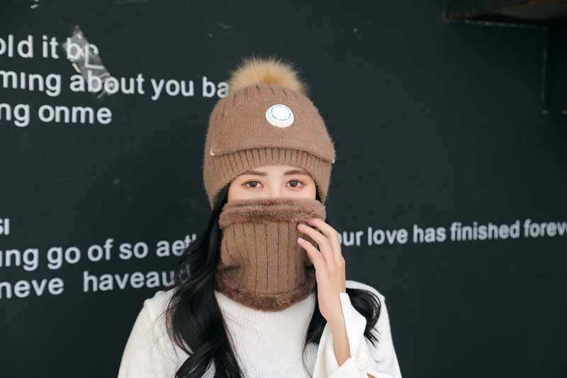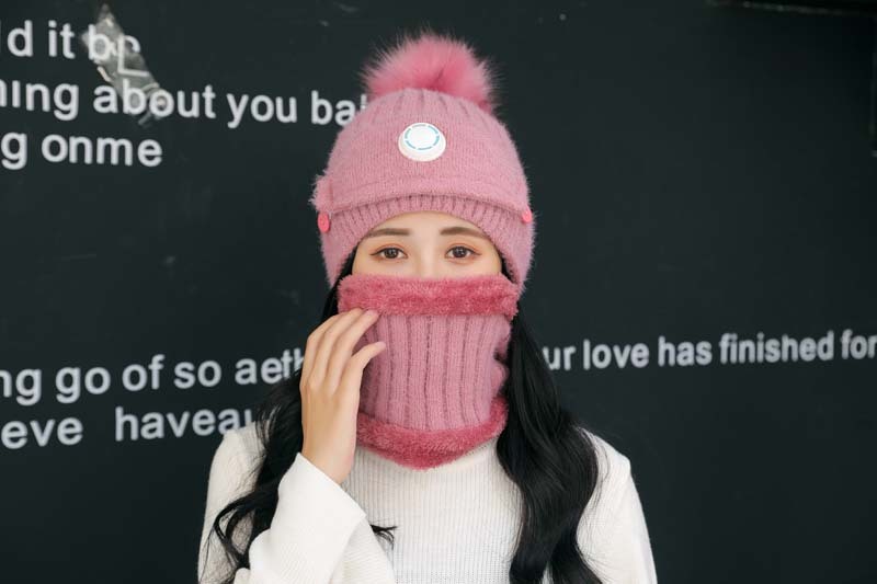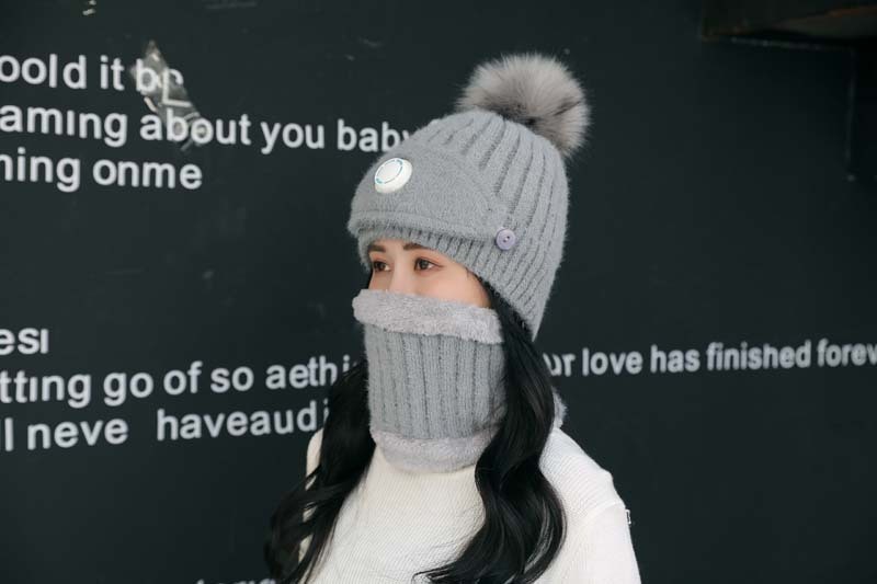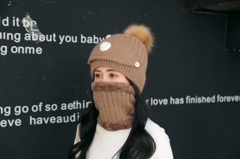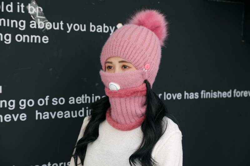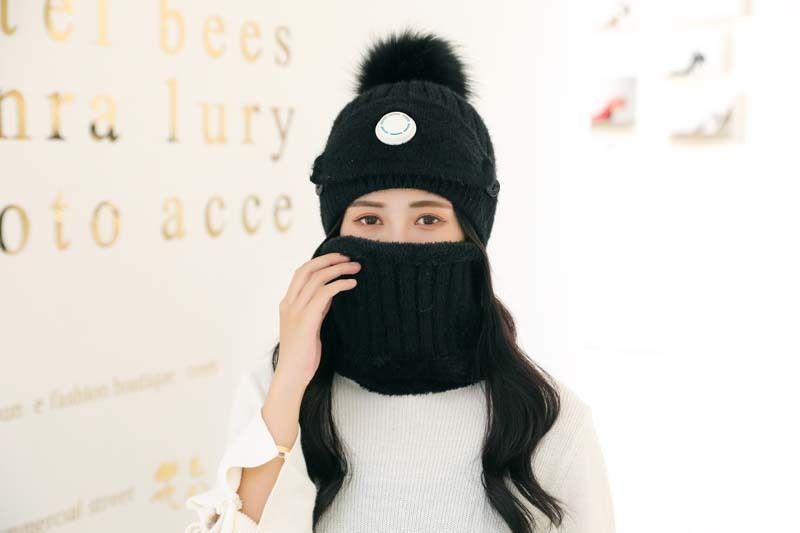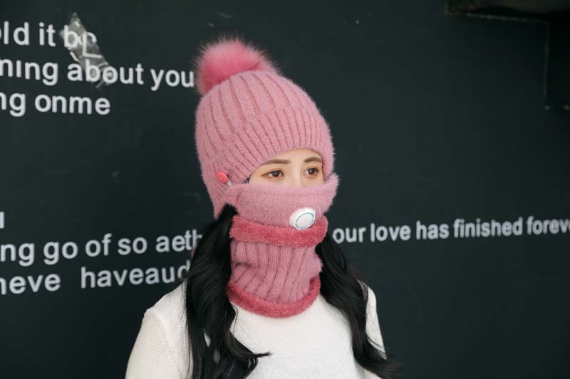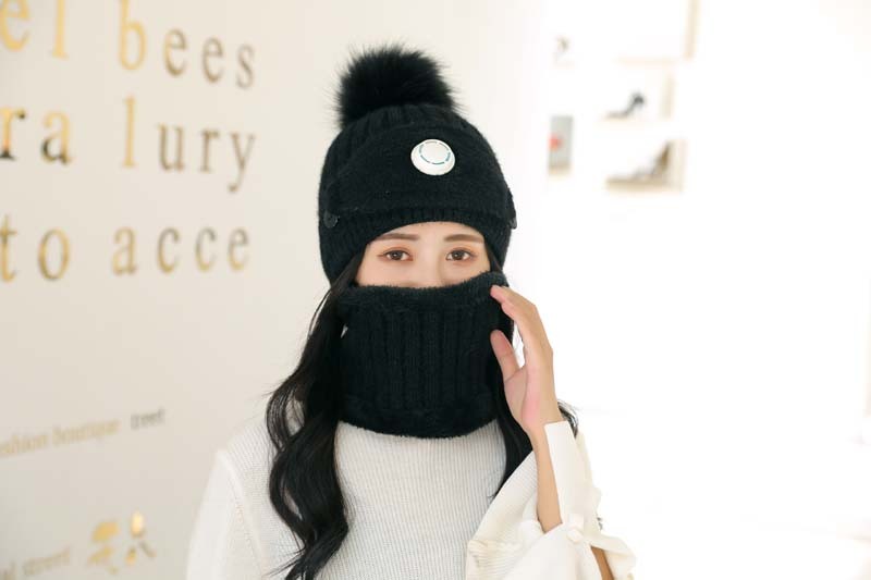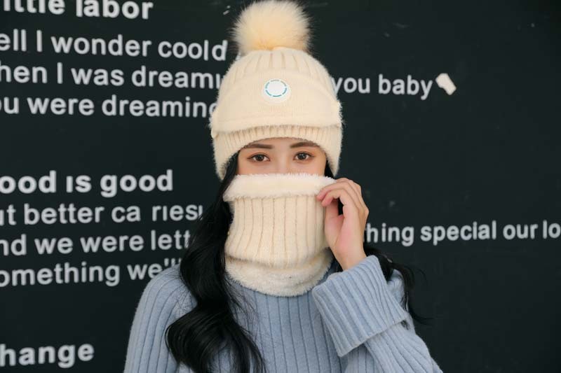 新款女士针织口罩帽子冬季保暖围巾帽子口罩三件套毛球帽子批发