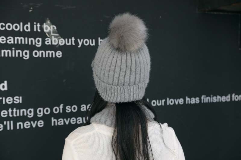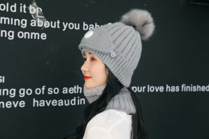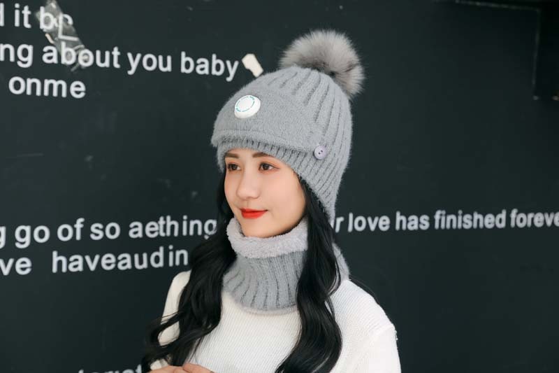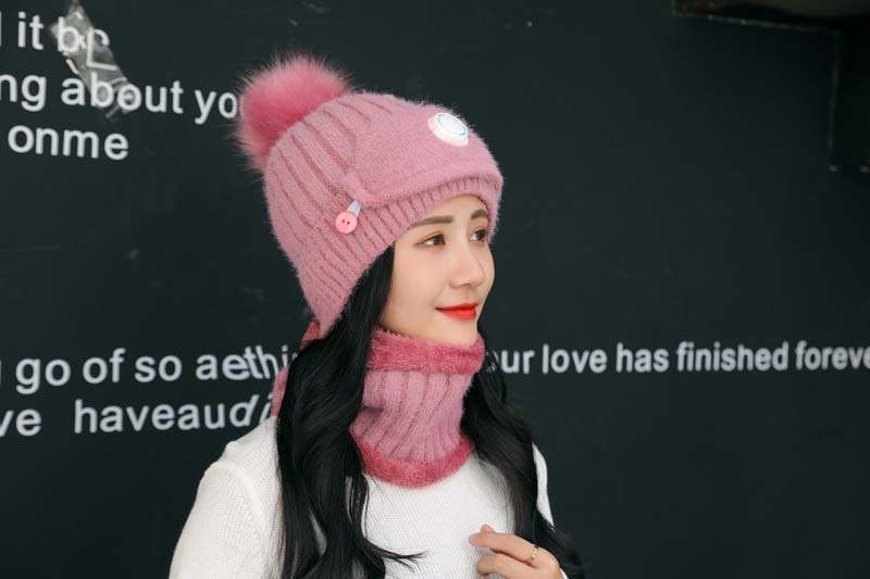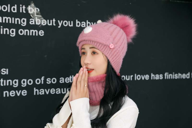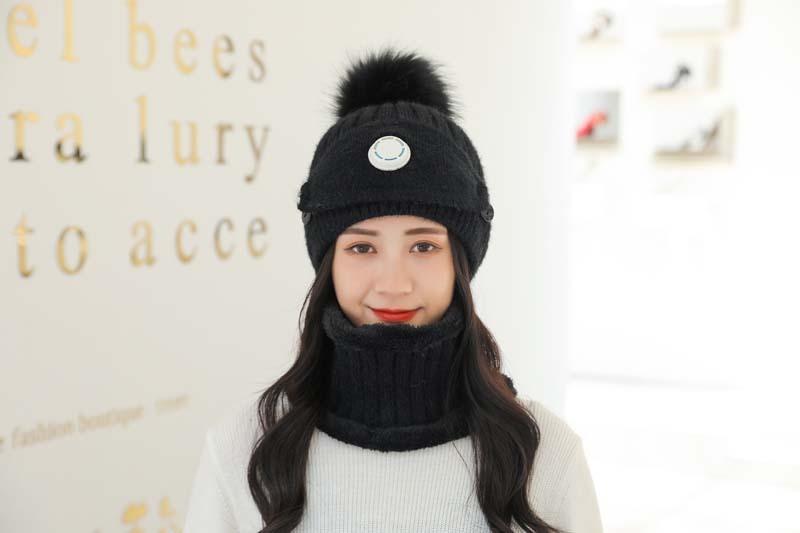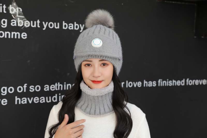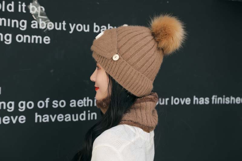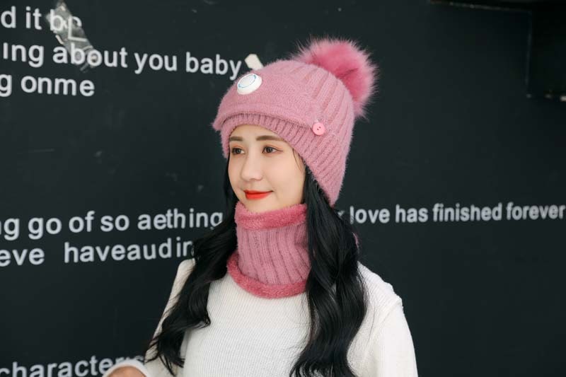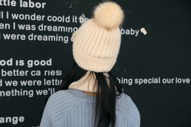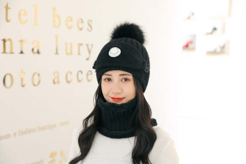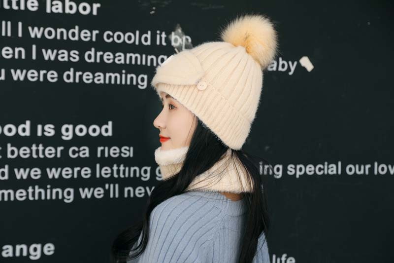 新款女士针织口罩帽子冬季保暖围巾帽子口罩三件套毛球帽子批发