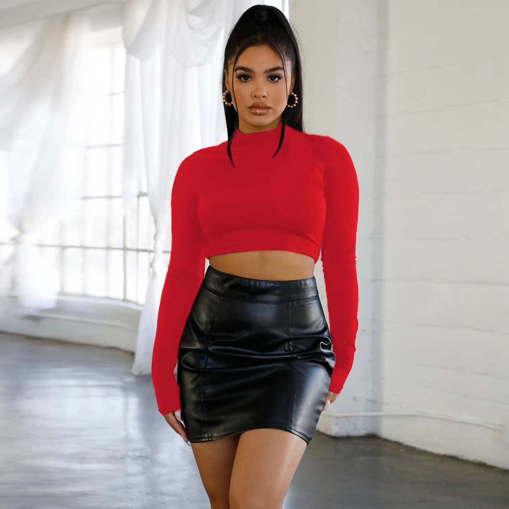 秋冬新款暗黑系欧美风性感露脐短款高领长袖打底上衣高领紧身T恤