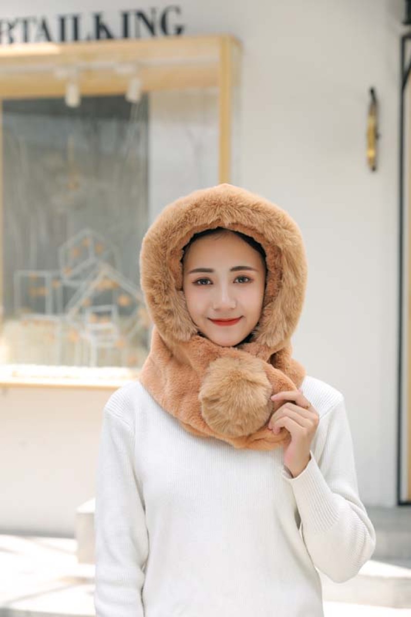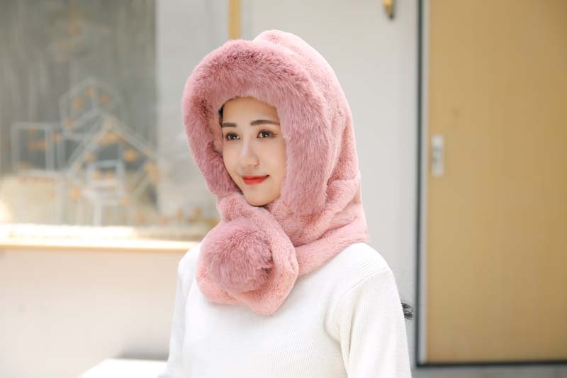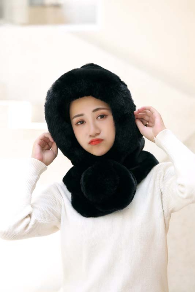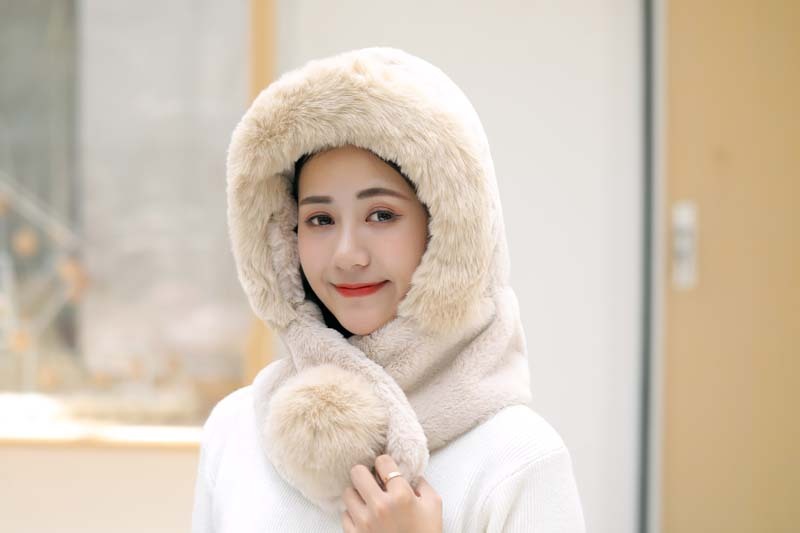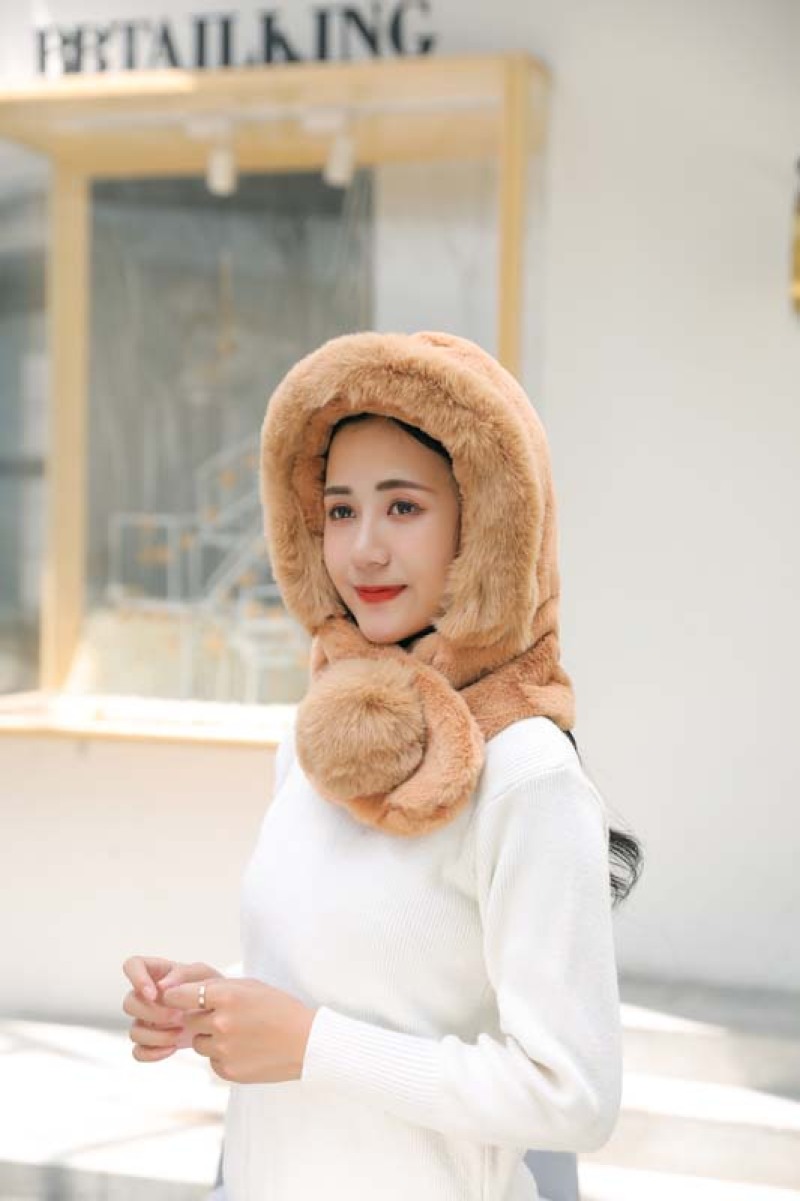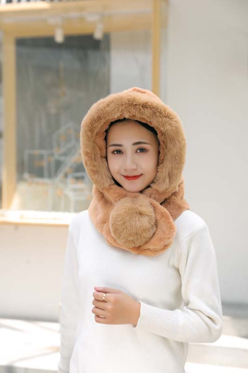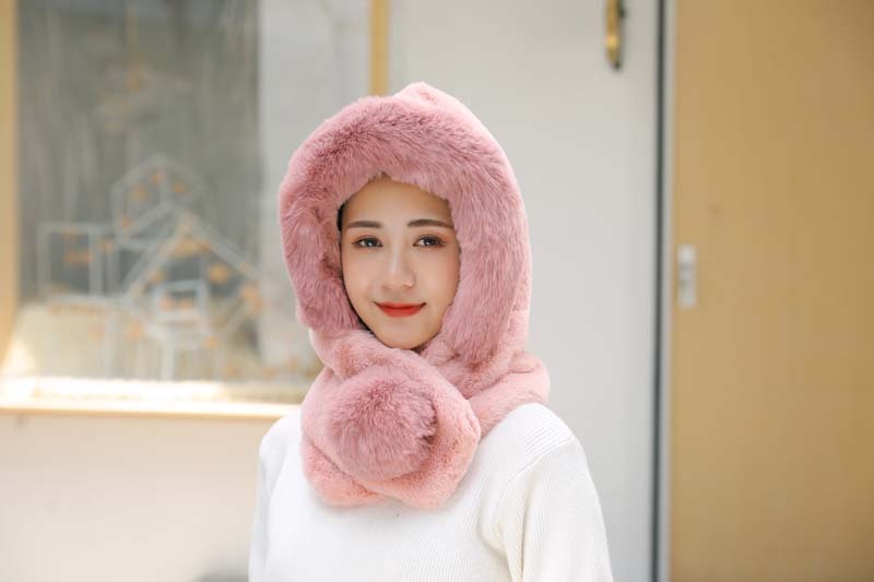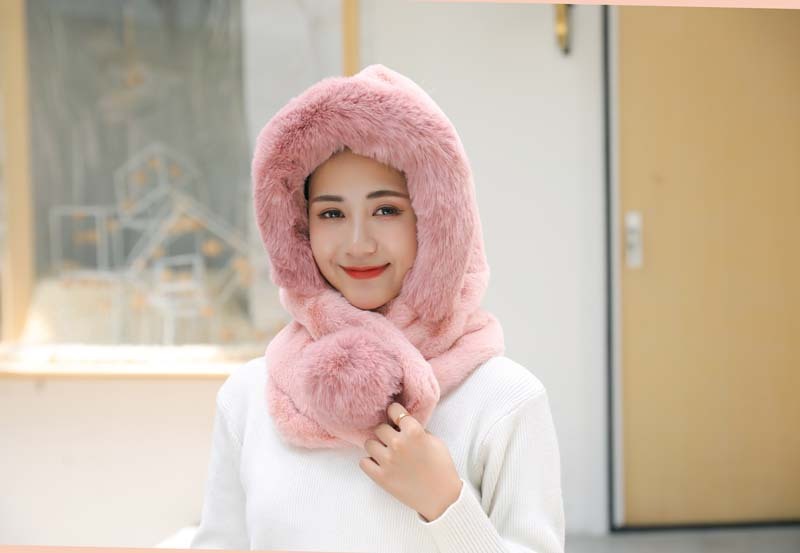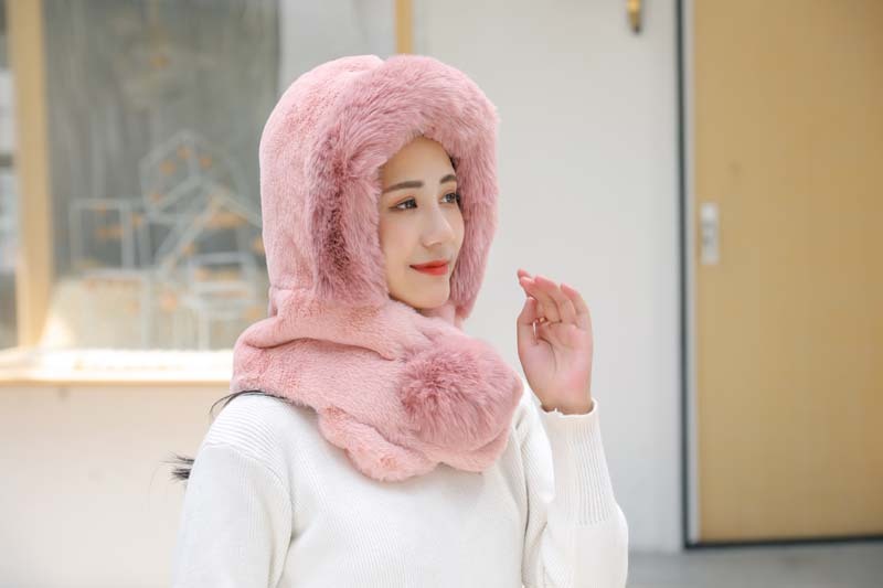 围巾帽子一体女保暖加厚毛毛皮草围脖帽子冬季百搭毛球围巾帽子