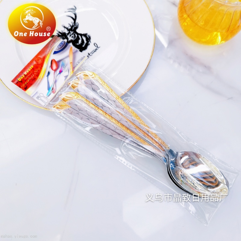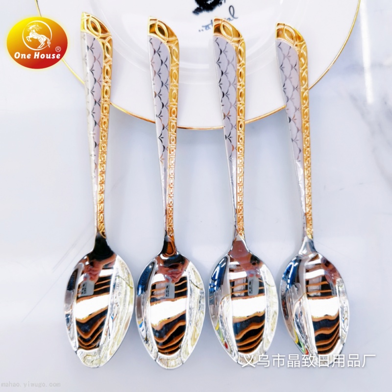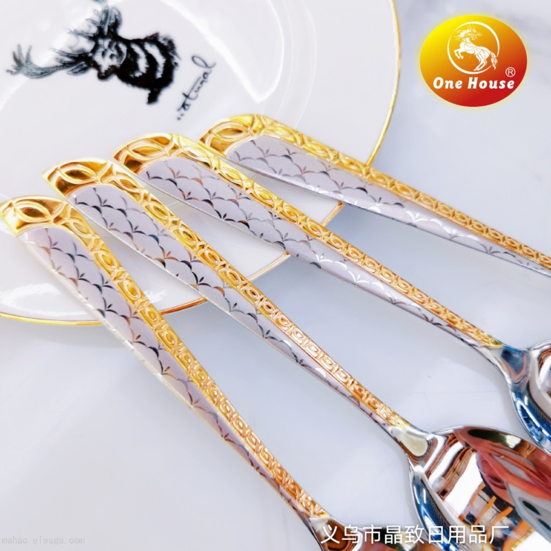 晶致厂家直销不锈钢镀金西餐餐具斜柄激光花纹手柄高档餐勺咖啡勺