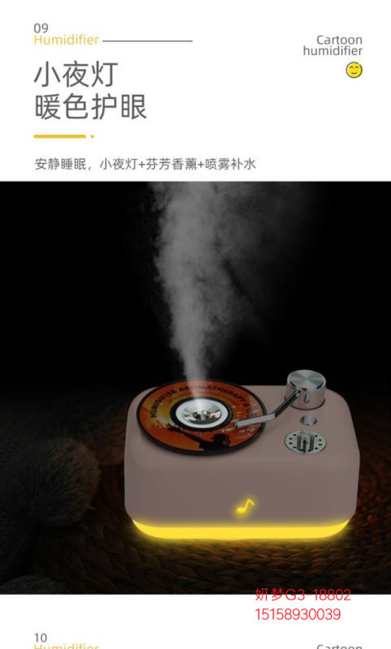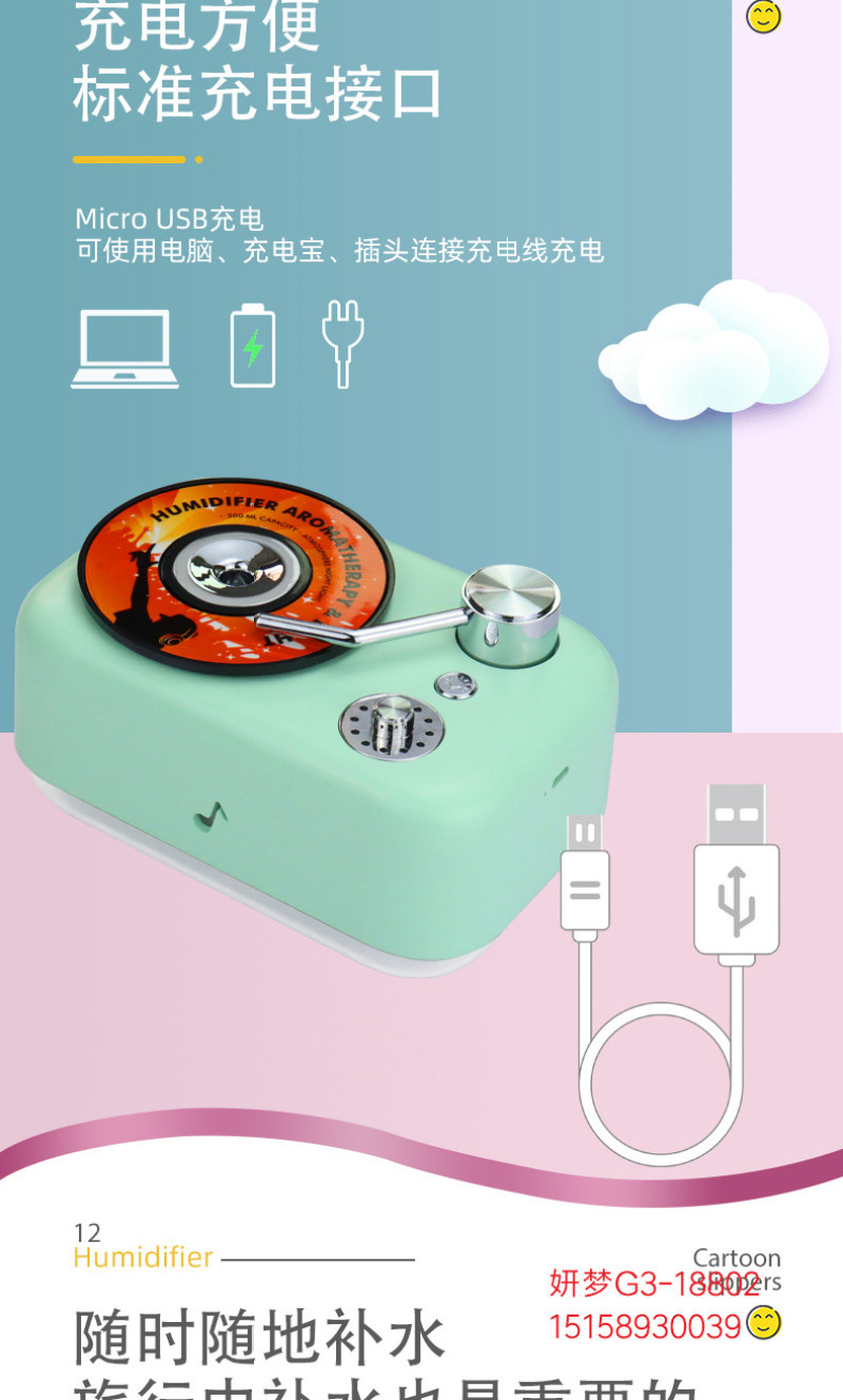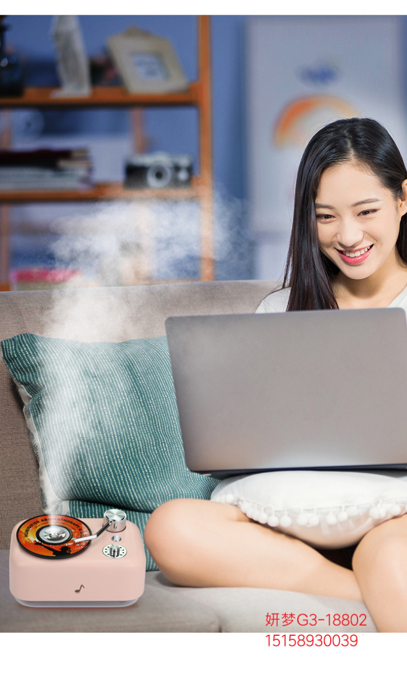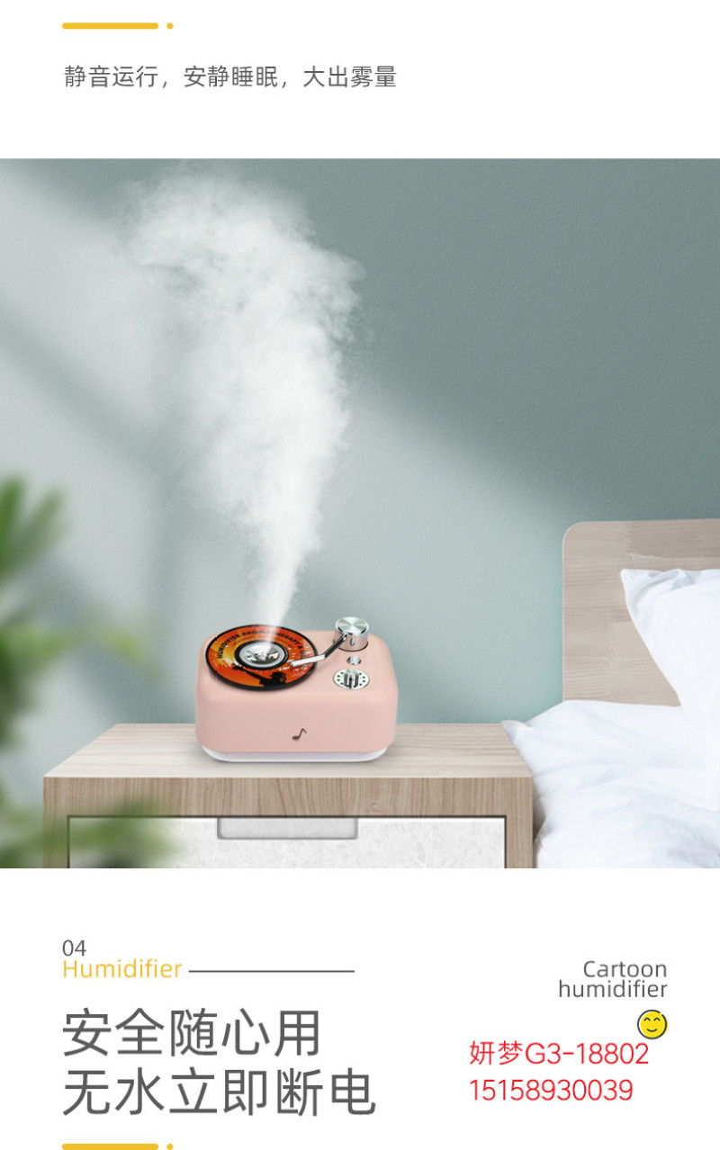 usb迷你加湿器香薰小夜灯喷雾器家用静音卧室空气净化唱片机造型
