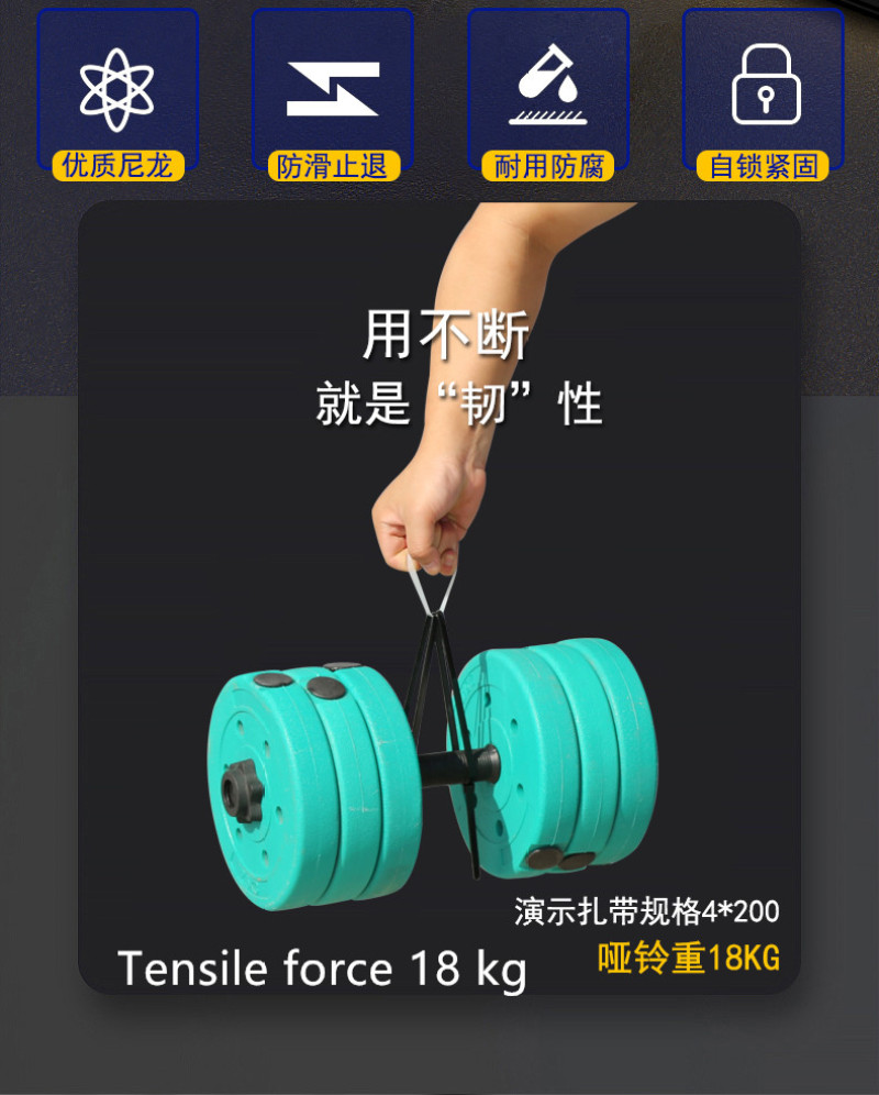 5.扎带采用UL认可之尼龙-66料制成,防火等级94V-2,耐酸、腐蚀、绝缘性良好、不易老化、重量轻、承受力强。操作温度为零下40到90度。综合机械性能远远优于一般工程塑料、是代替铜、不锈钢及其他有色金属的理想材料。