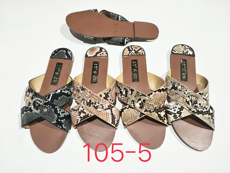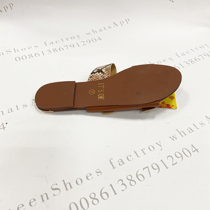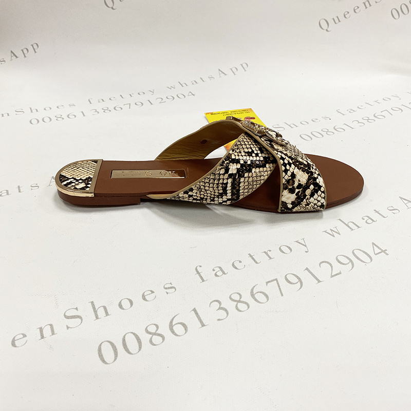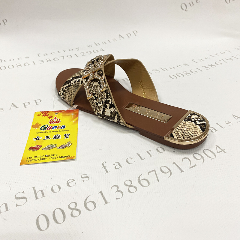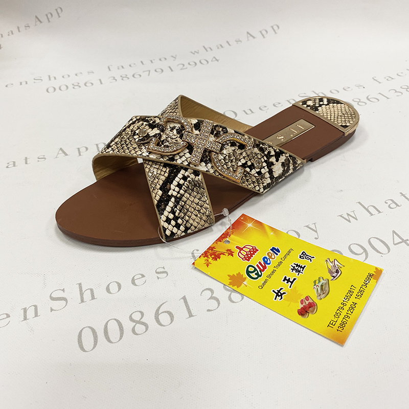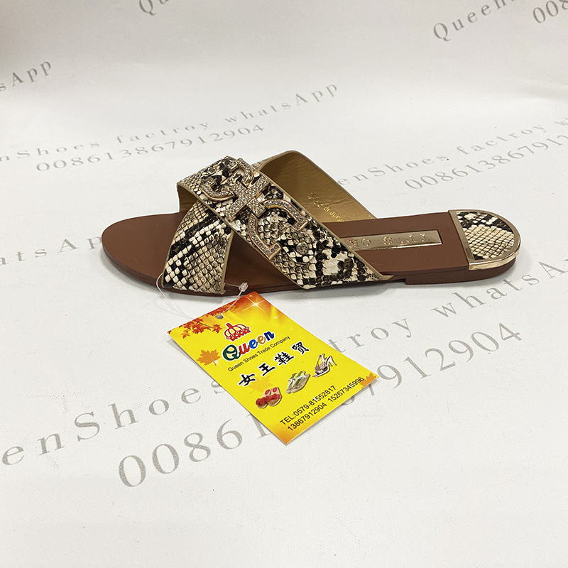 夏季时尚交叉带面女凉拖金属水钻装饰扣蛇纹面料女拖现货