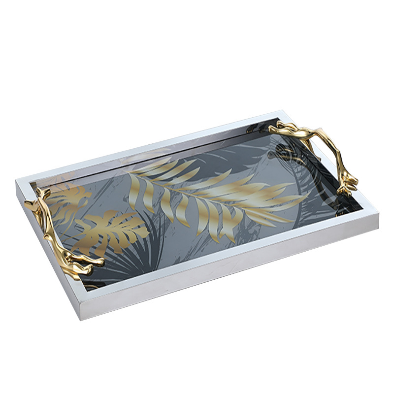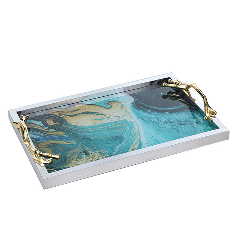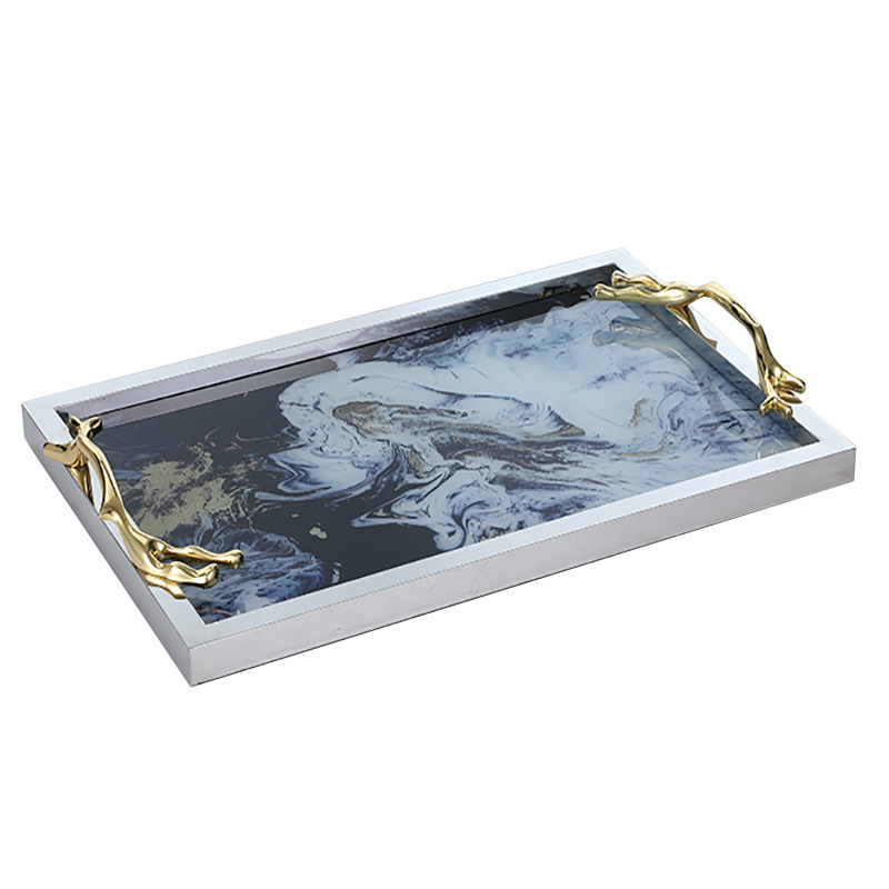 北欧复古风格铜把手玻璃托盘特大号收纳盘星空纹茶盘家居装饰摆件