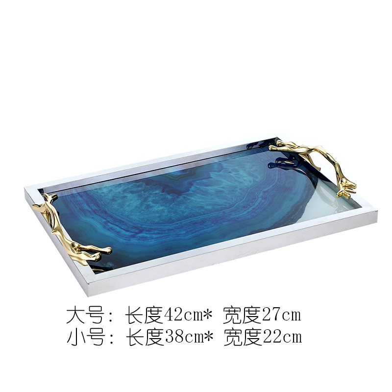 北欧轻奢蓝色玛瑙石托盘金属装饰品客厅餐桌收纳摆设样板房摆件..