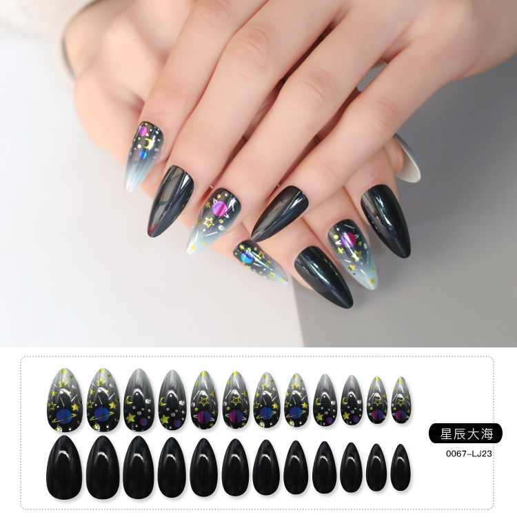 欧美热销24片杏仁甲尖头假指甲Ins金属鎏金渐变黑水滴穿戴甲成品
